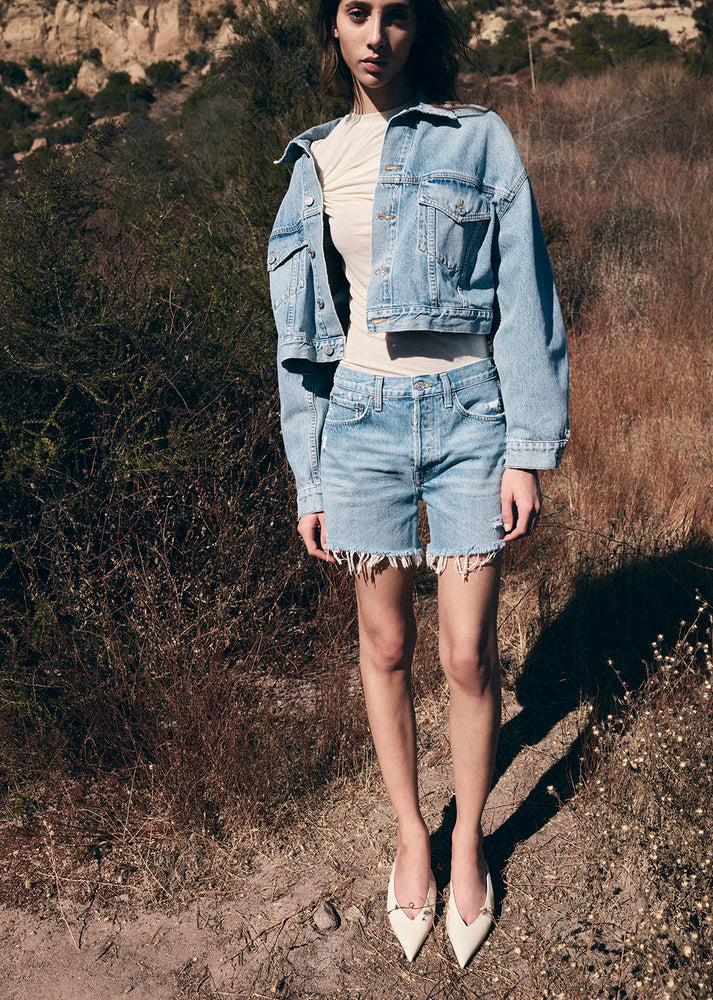 The Parker Long shorts are crafted from bright indigo denim with a vintage-inspired appeal, offering a relaxed high-rise and a comfortable fit through the thighs. Made from regenerative cotton, these shorts are a versatile wardrobe staple—effortlessly pairing with everything from casual tees to more elevated pieces. A true favorite, these shorts combine timeless style with everyday wearability.
