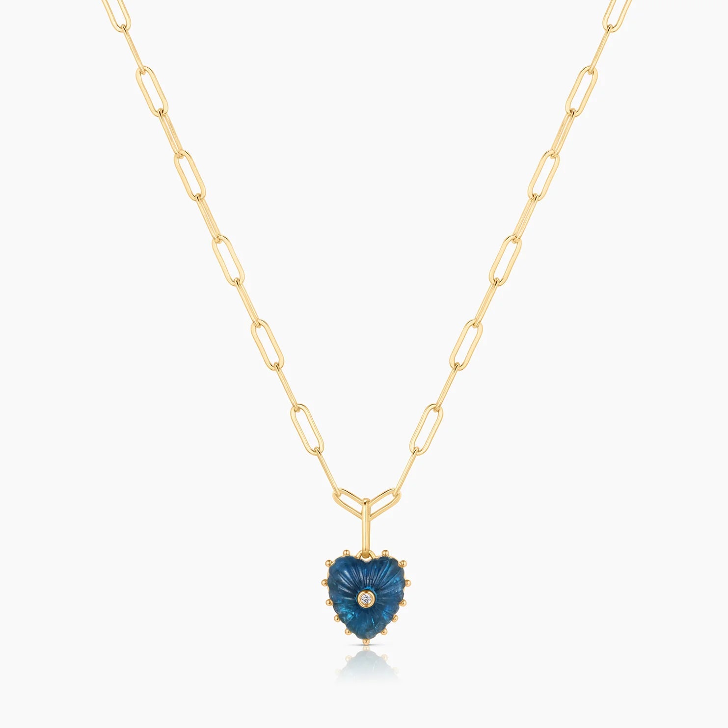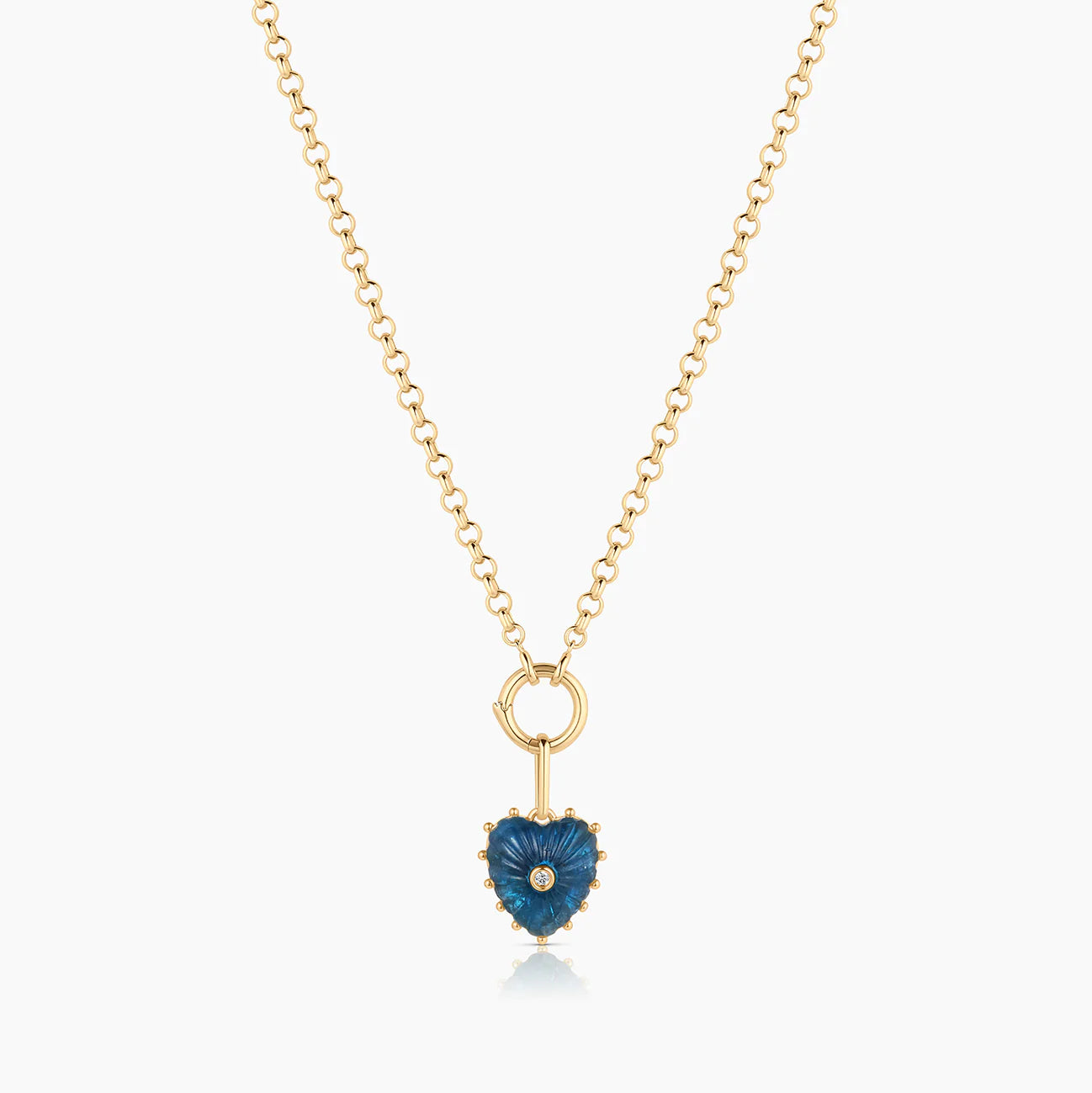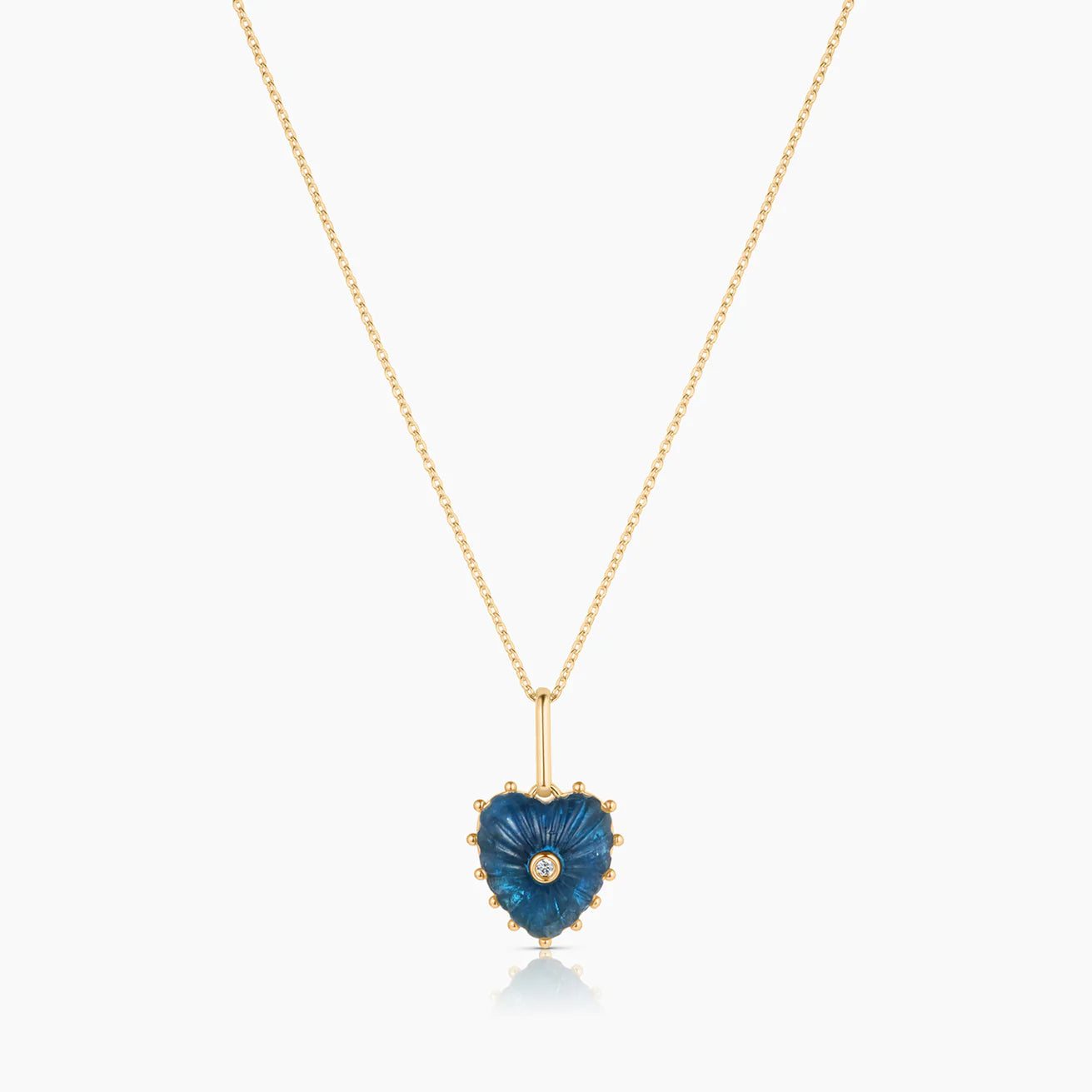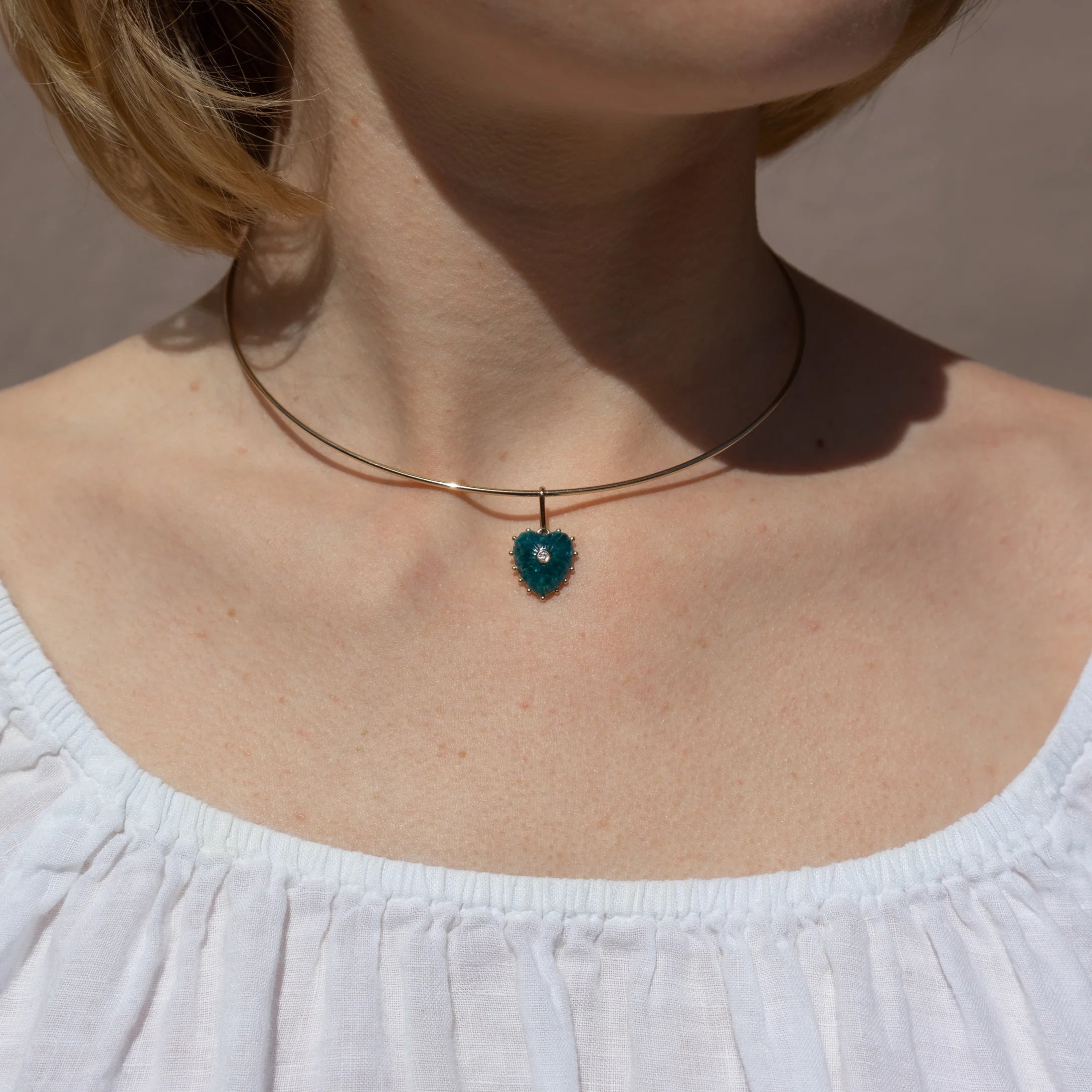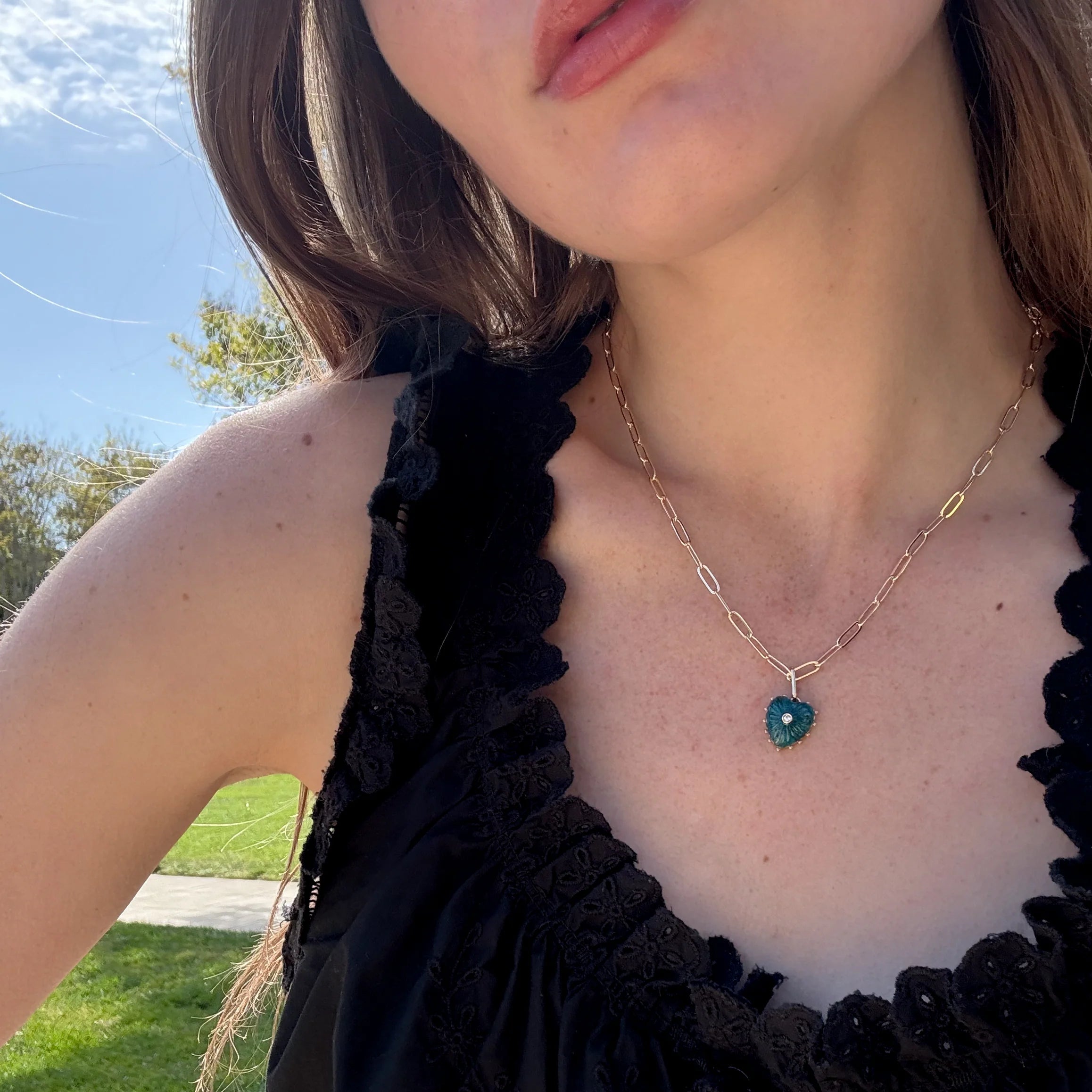 She's Malene's baby sister, a smaller hand-carved apatite heart charm with a sparkling center stone. A favorite for gifting and layering.