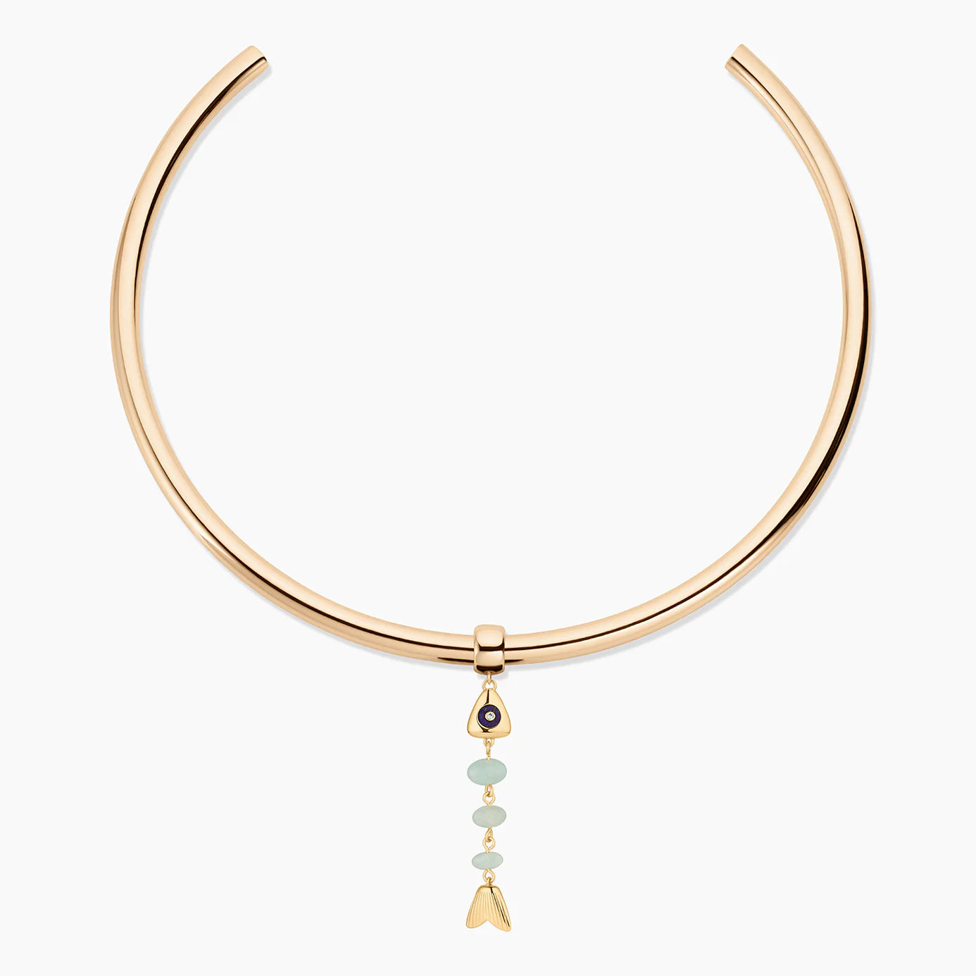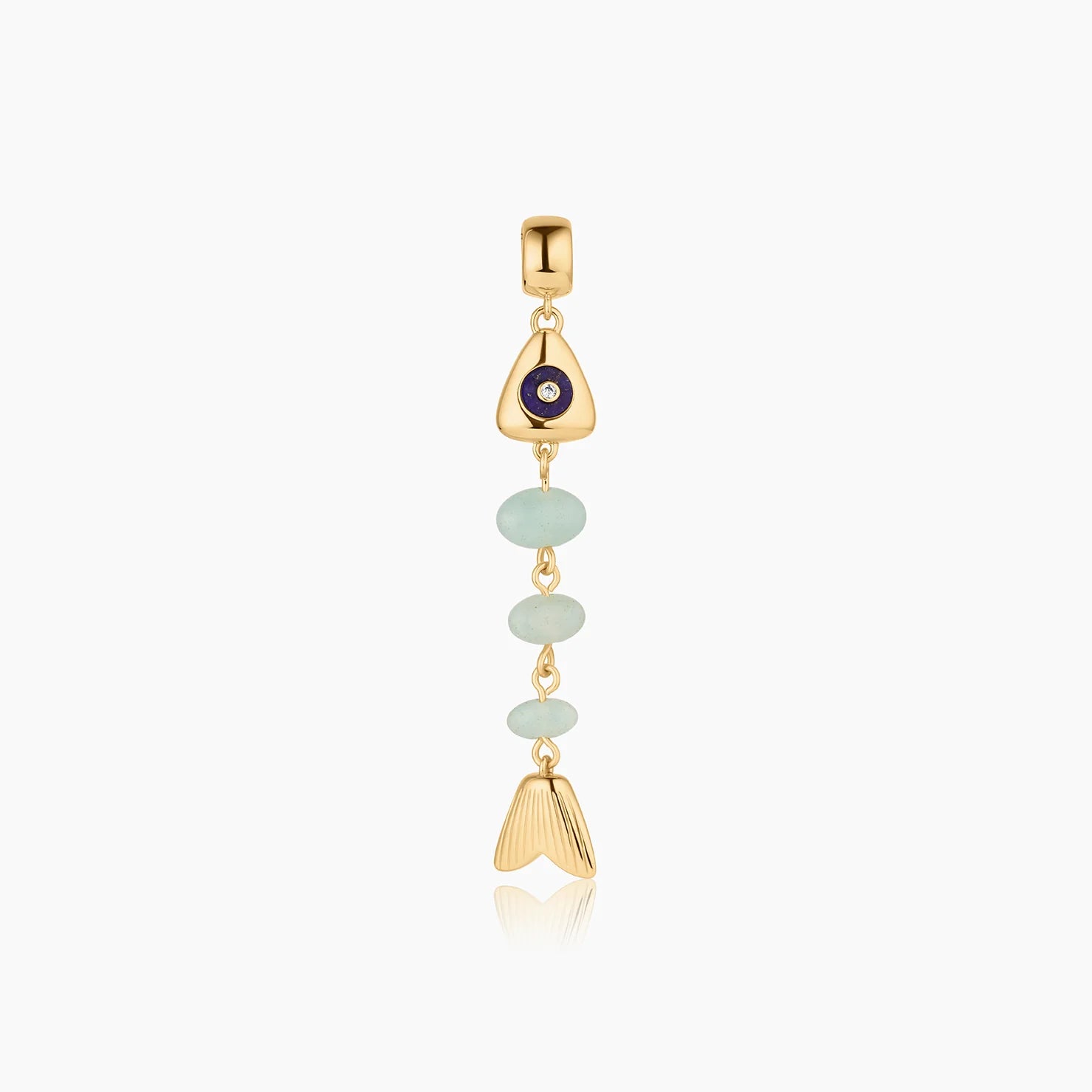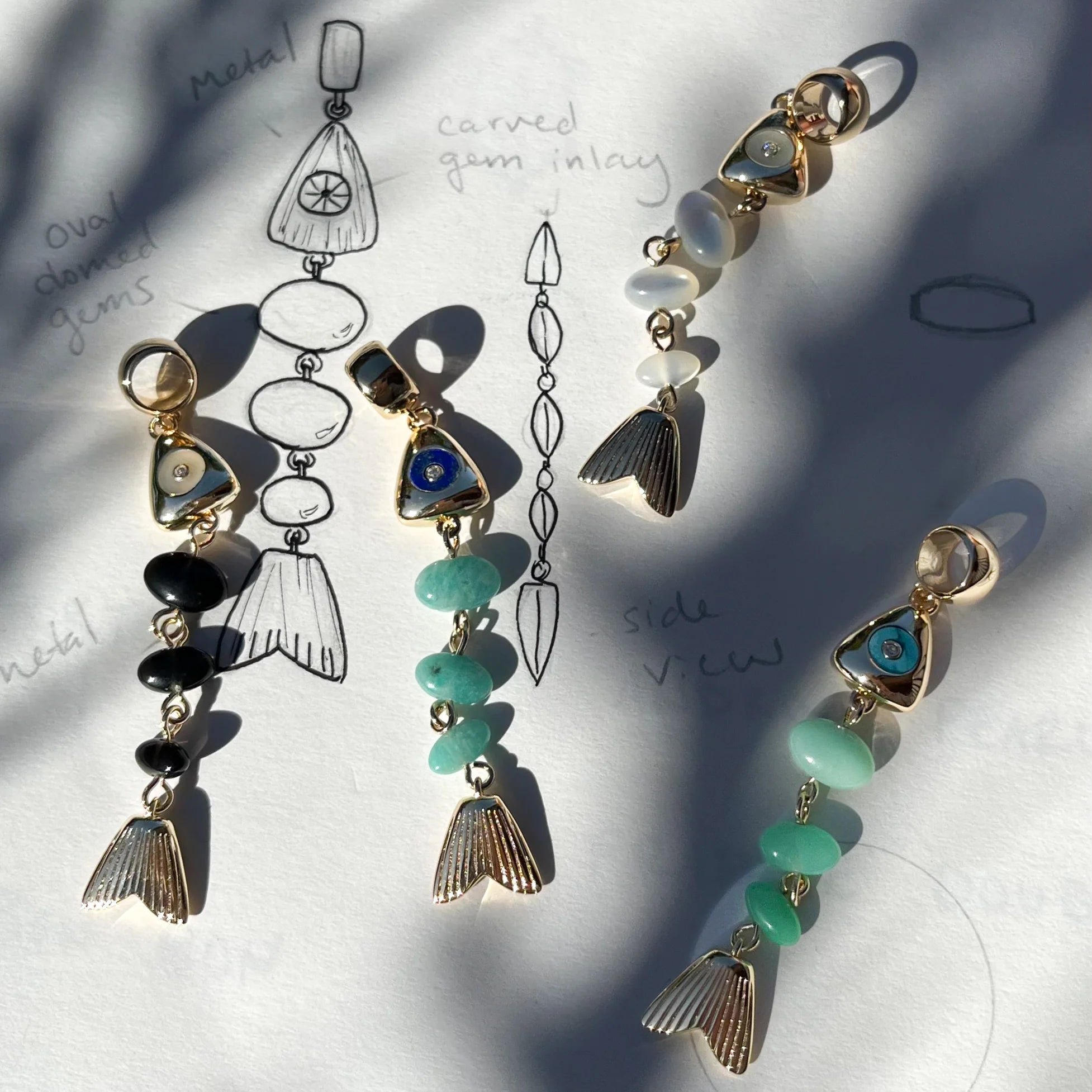 This skeletal fish charm is unlike any you've seen before. A fish bone-inspired silhouette created with hand-carved drop gemstones and a contrasting gemstone eye, complete with CZ sparkle. This delicate beauty adds movement and sparkle, and has become our new favorite treasure from our jewelry box.