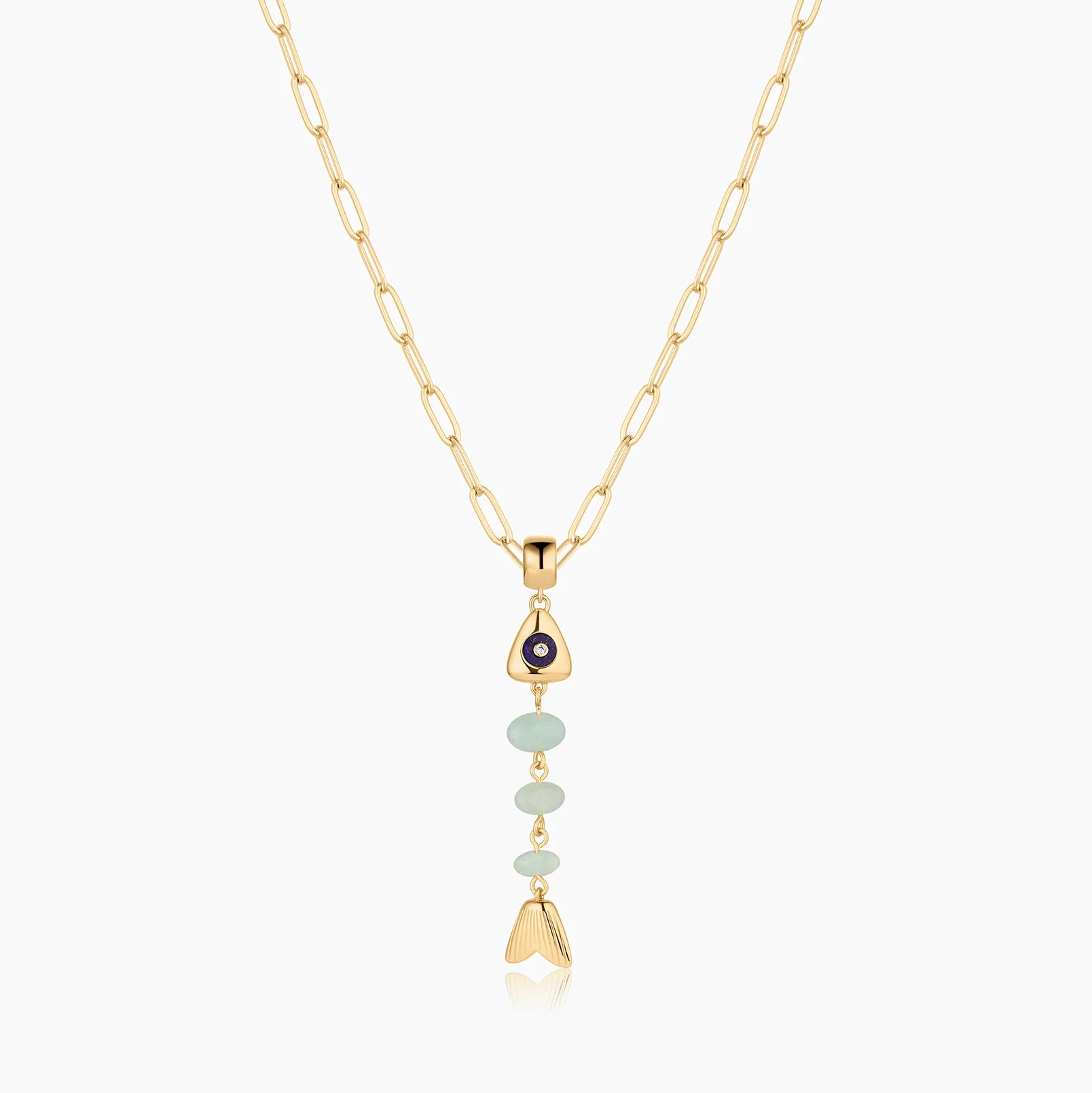 Materials: 14k gold plated, hand-carved amazonite with a lapis eye, cubic zirconia