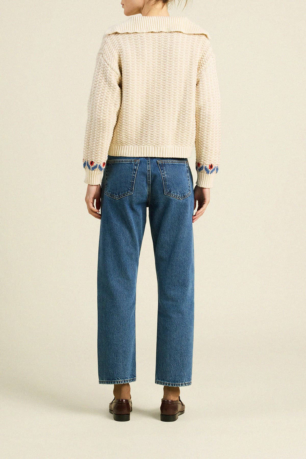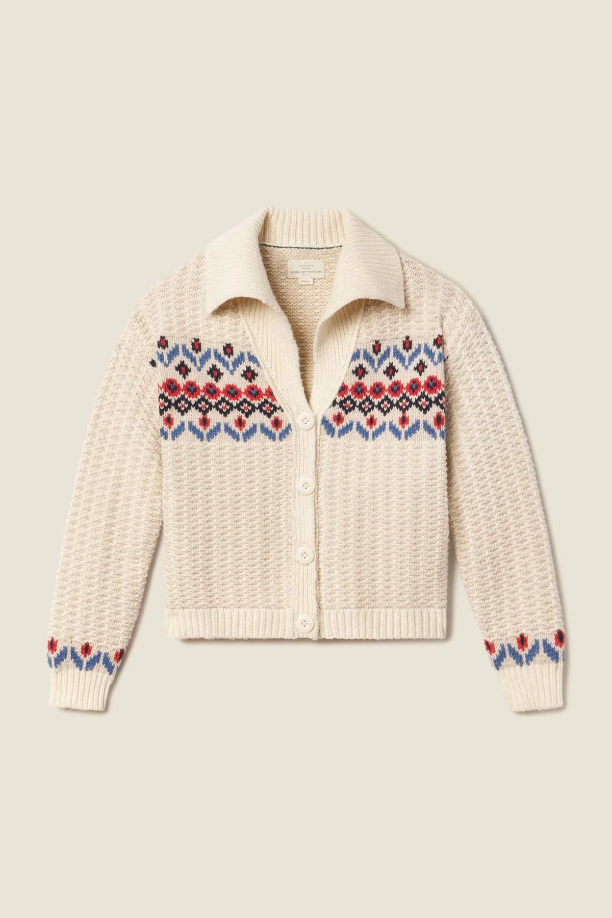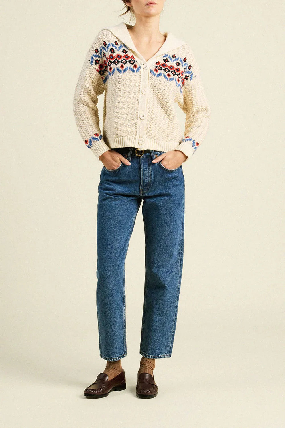 The Savannah cardigan has a textured basket weave in antique white with complementary cream sailor collar and cuffs. Finished with our gold owl buttons. Shown here in Antique White Fairisle and made from our merino wool.