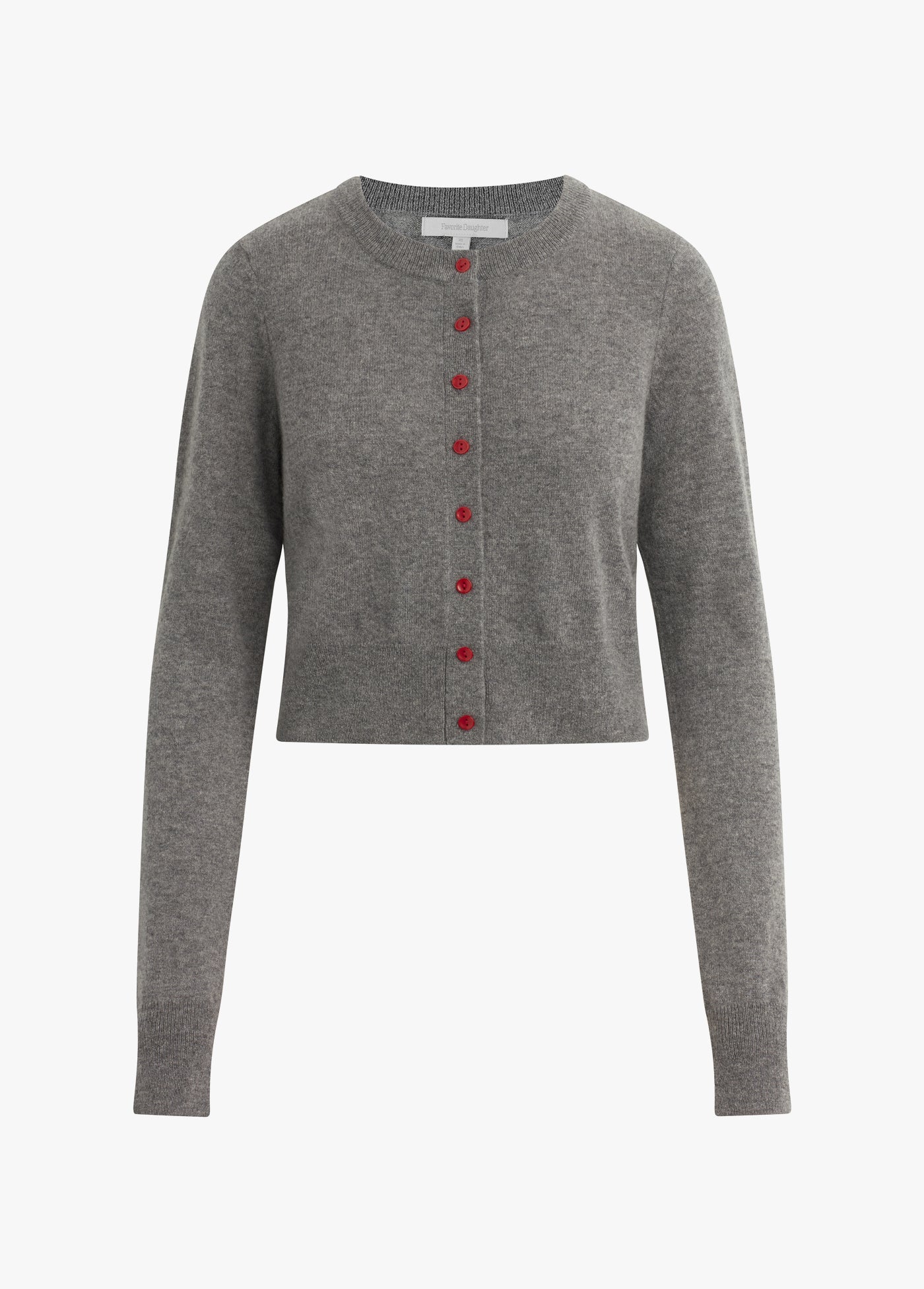 The best-selling Rebecca Cardigan, cropped. Made from the softest cashmere in a wear-with-everything length and a classic fit. It's a favorite in charcoal grey with red buttons. Make it a set with The Rebecca Cami or toss over your shoulders with pretty much anything.