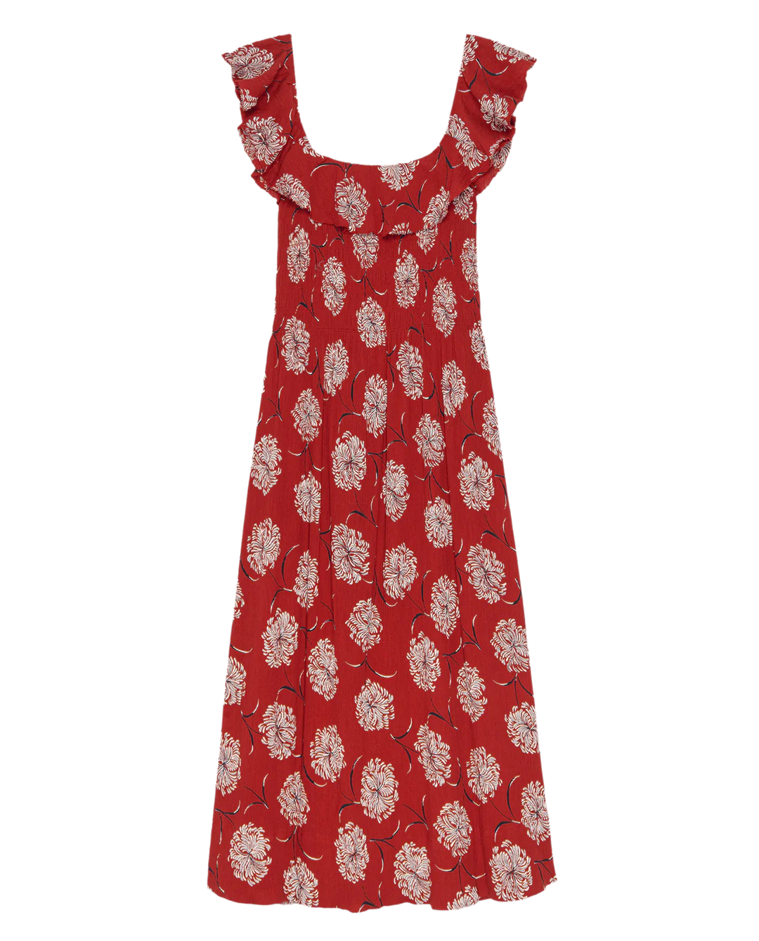 The Havana Dress is made for easy summer days that slip into warm nights. The bodice is fully smocked with lightly elasticated rows for a comfortable, flexible fit, balanced by an open neckline edged with a soft ruffle. A metal zip closure at the back keeps the look clean. Flowing through the hips with a full sweep that hits at the ankle, it moves with you — relaxed, breezy, and perfect worn back to a strappy sandal.