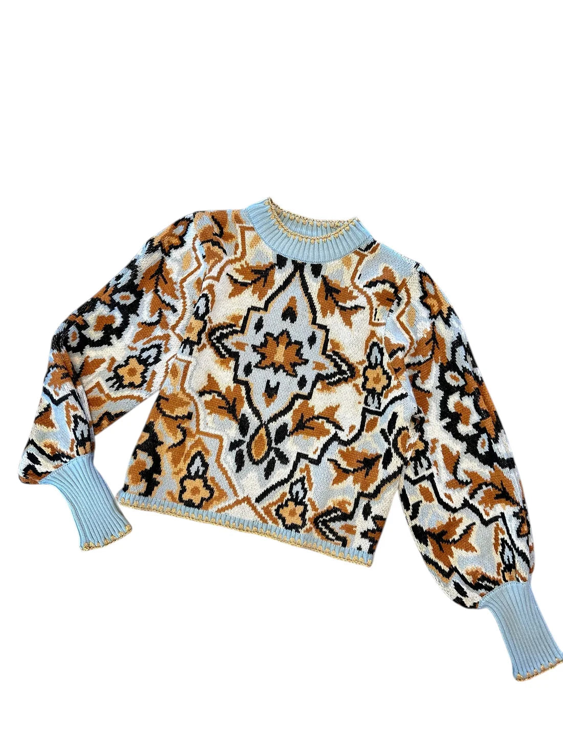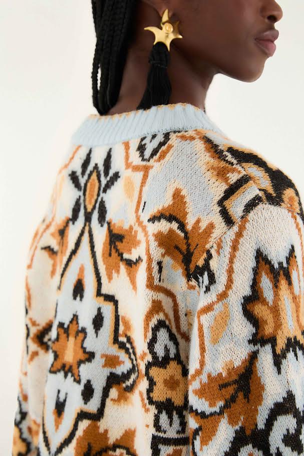 Embrace cozy elegance with the Winter Tapestry Sweater in Blue by Farm Rio. Crafted to keep you warm while showcasing a vibrant tapestry-inspired design, this sweater adds a unique touch to your winter wardrobe. Its rich blue hues and intricate patterns make it a standout piece perfect for layering or wearing on its own. Stay stylish and comfortable through the cold season with this eye-catching, versatile sweater.