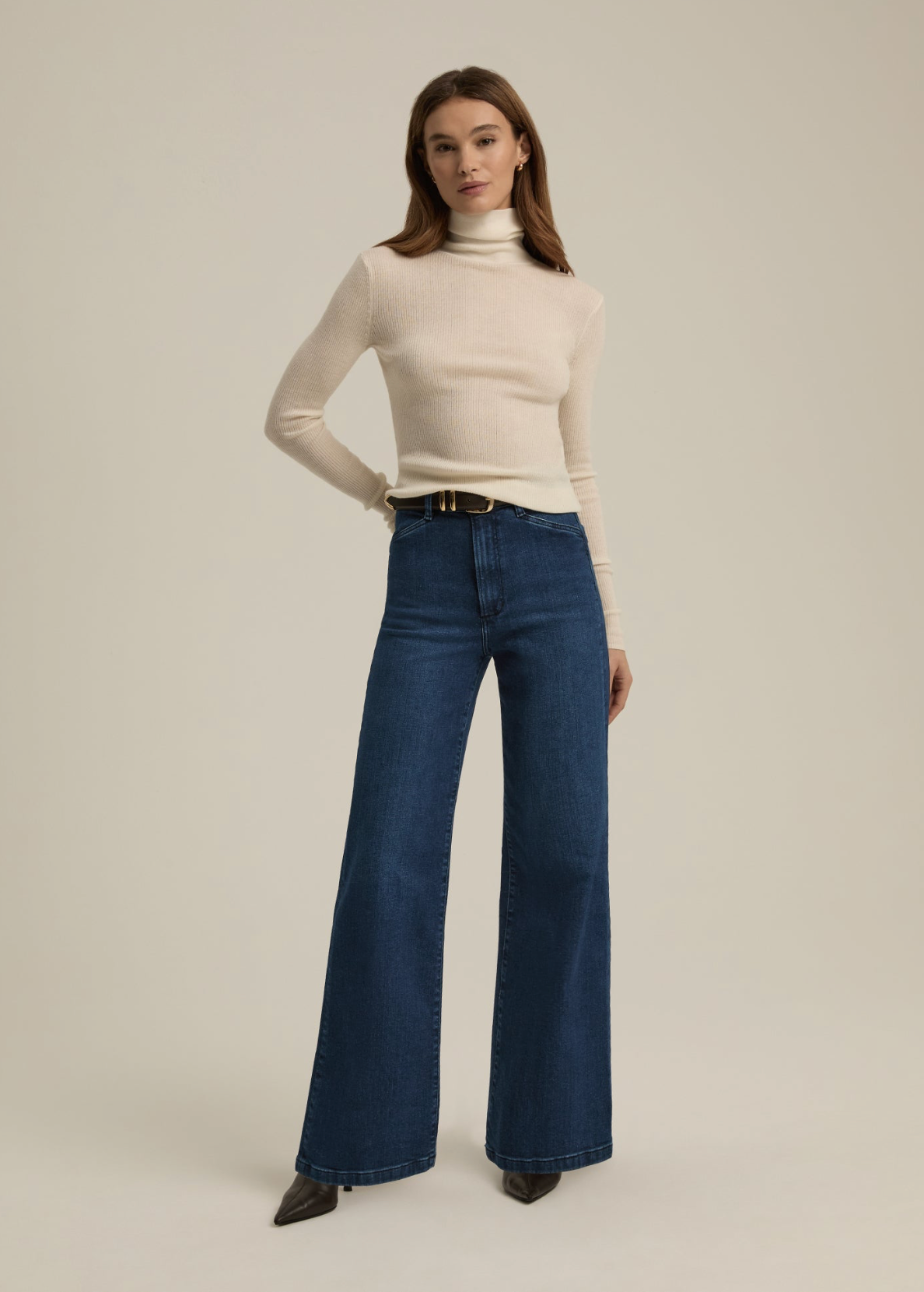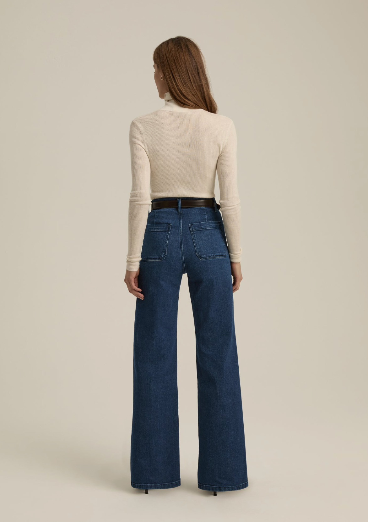 The wide leg, wide hem Mischa jean has a 11.75" super high-rise that's slightly pinched at the waist and fitted through the hips with a 29.5" inseam. The rich, dark indigo Columbia wash has just enough stretch for a comfortable fit.