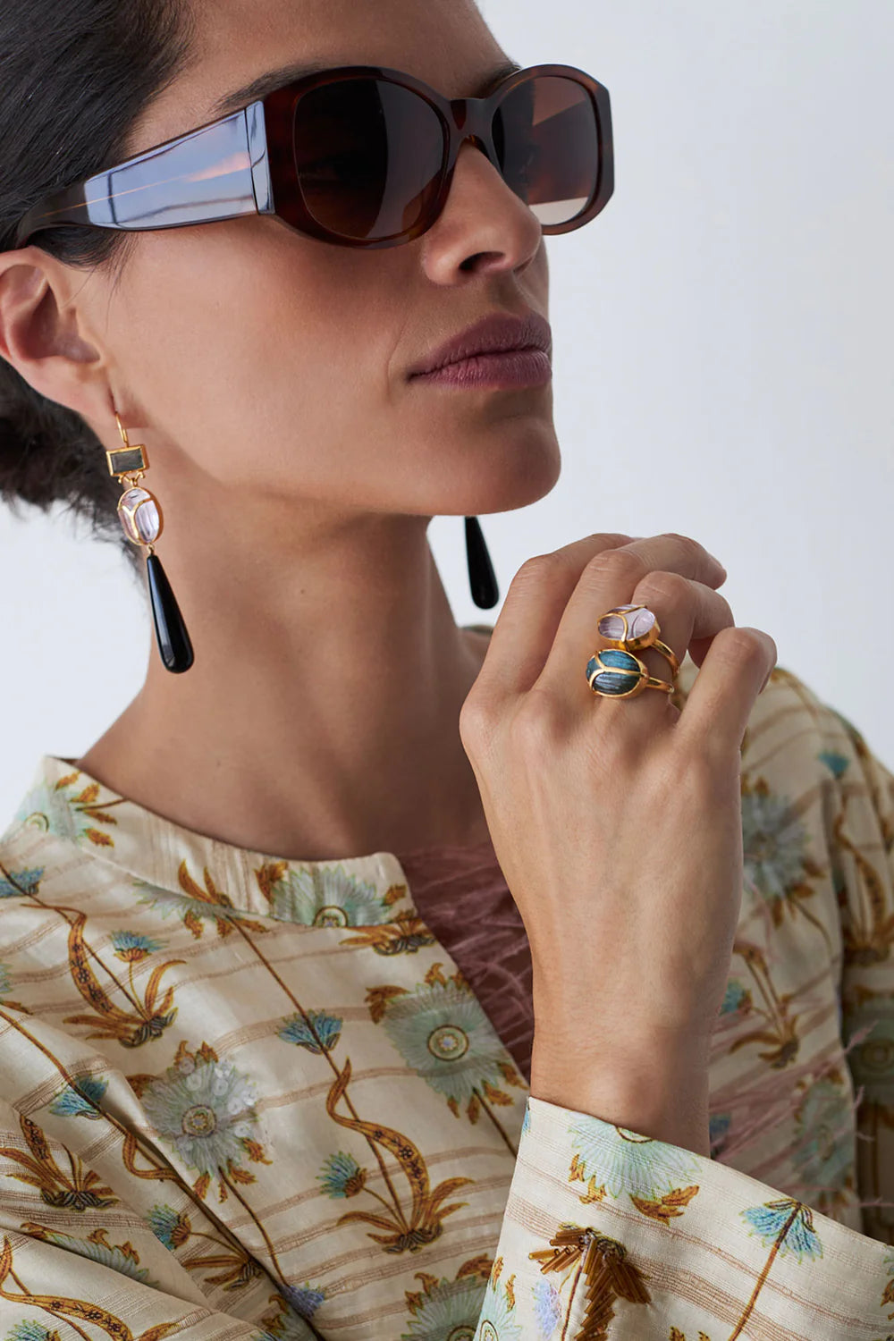Adorn your hand with the eye-catching Scarab Ring featuring a hand-carved amethyst scarab stone set in gold.