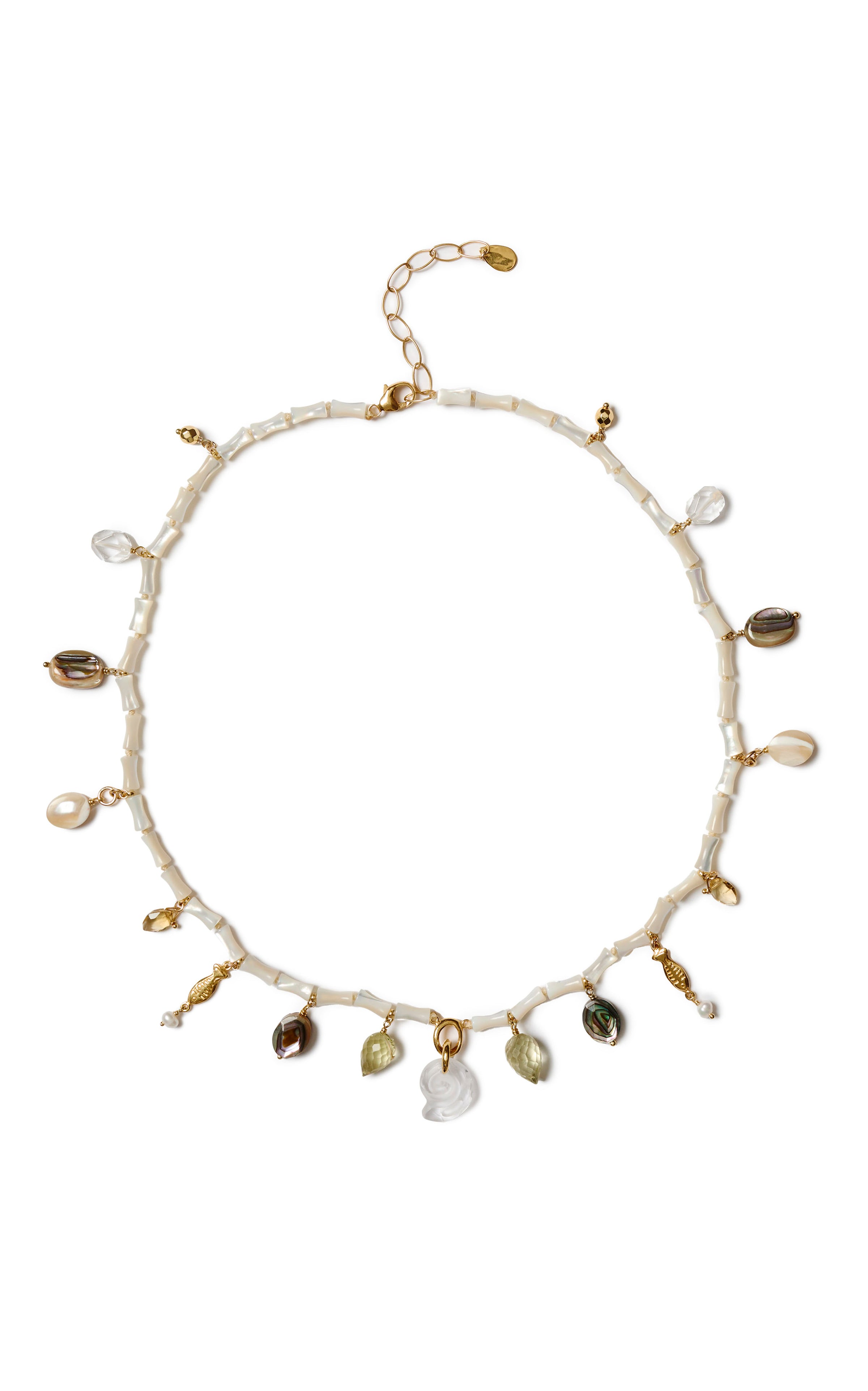 A transportive charm necklace, perfect for warm weather months. Mother of pearl, abalone, lemon quartz, citrine and fish charms capture the feeling of an endless summer day spent picking shells on the beach. Adjust to create your perfect fit.