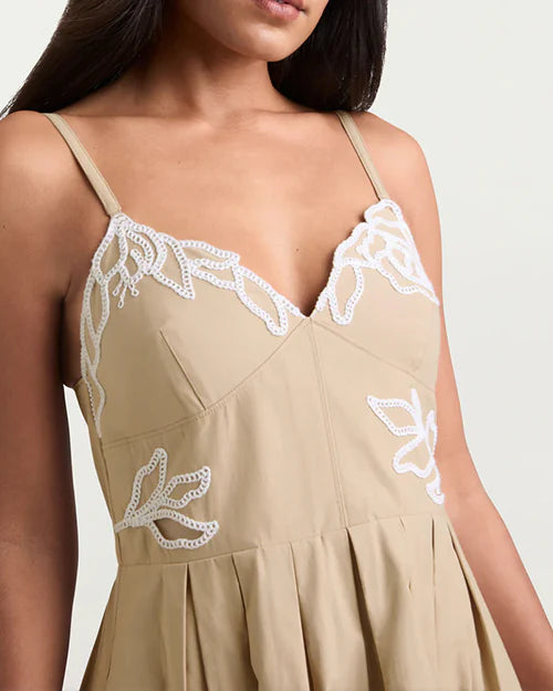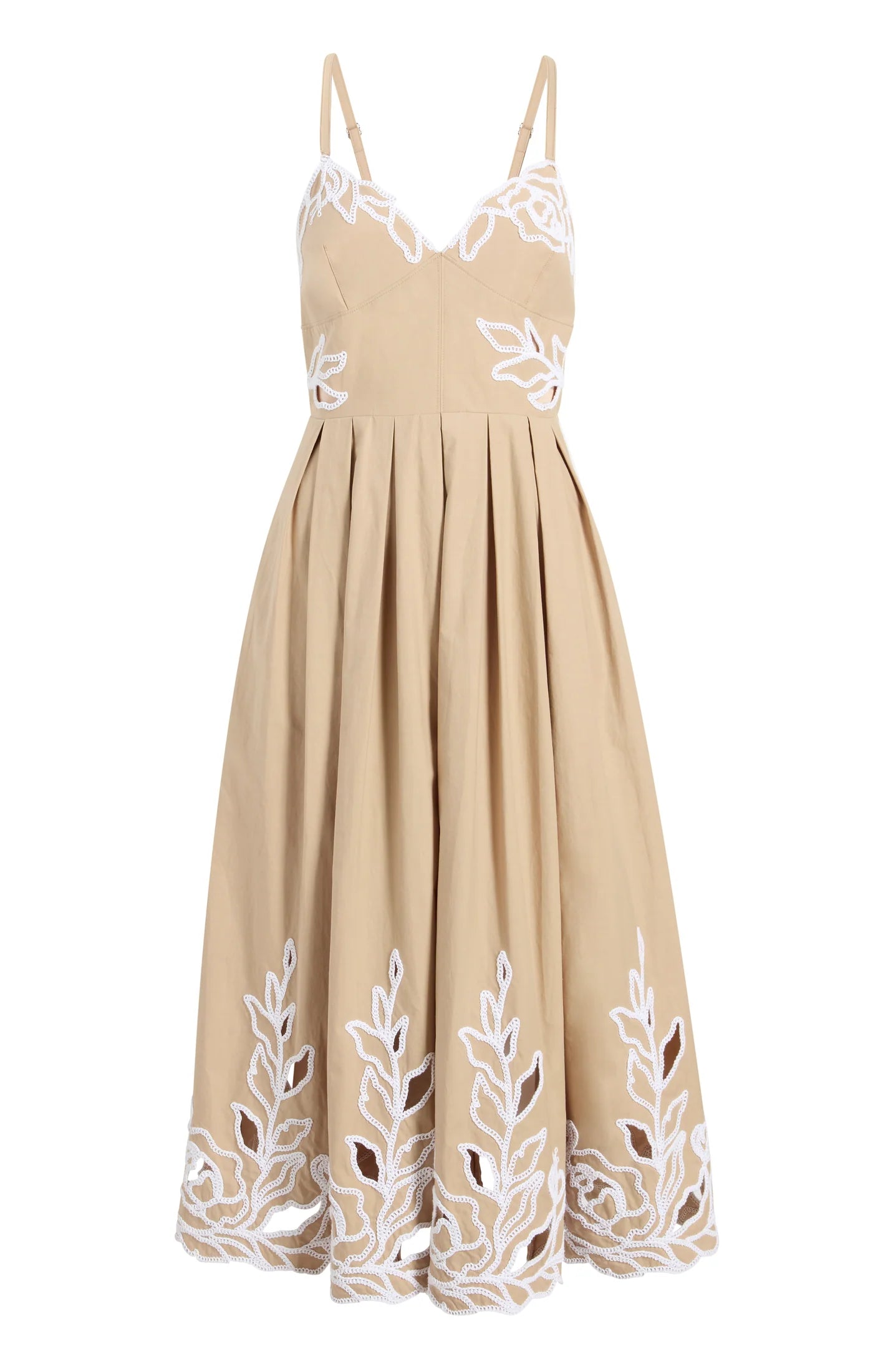 Get ready to bask in luxury with the Trailing Peonies Maude Dress. This khaki midi dress boasts a sweet sweetheart neckline and is adorned with stunning white floral patterns. Perfect for spring, this dress radiates elegance and refinement.