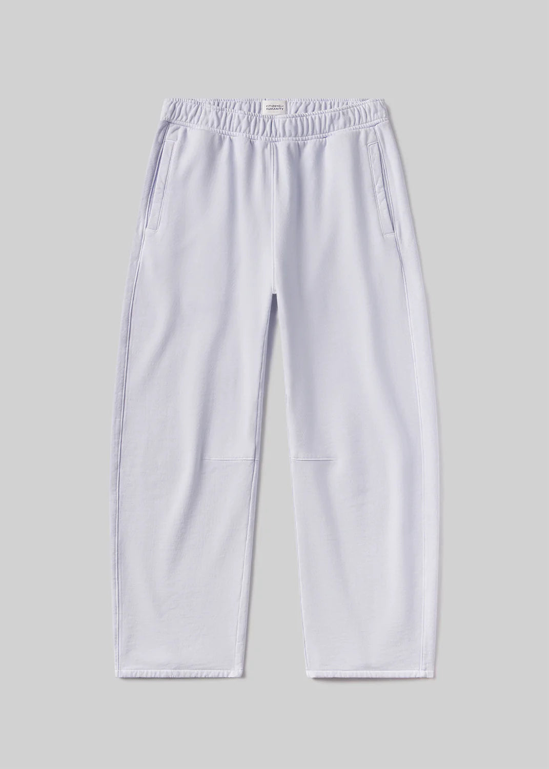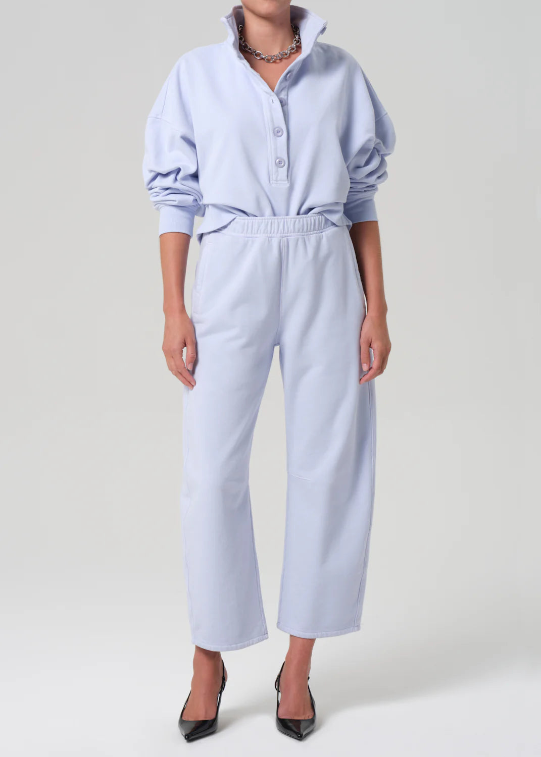 The Miro Sweatpant is crafted from soft brushed fleece with a cozy, plush feel. The light blue silhouette features a relaxed, tapered fit with a drawstring waist and ankle-length finish. Perfect for lounging or styled with matching sweat tops for a coordinated, casual look.