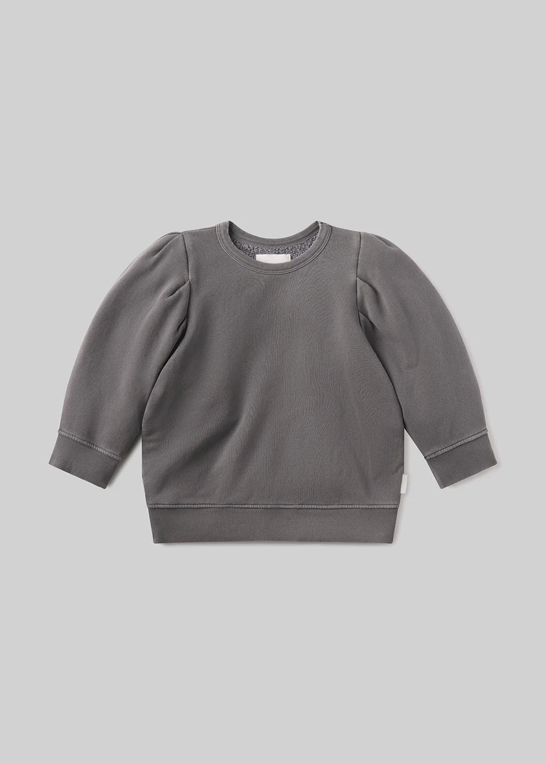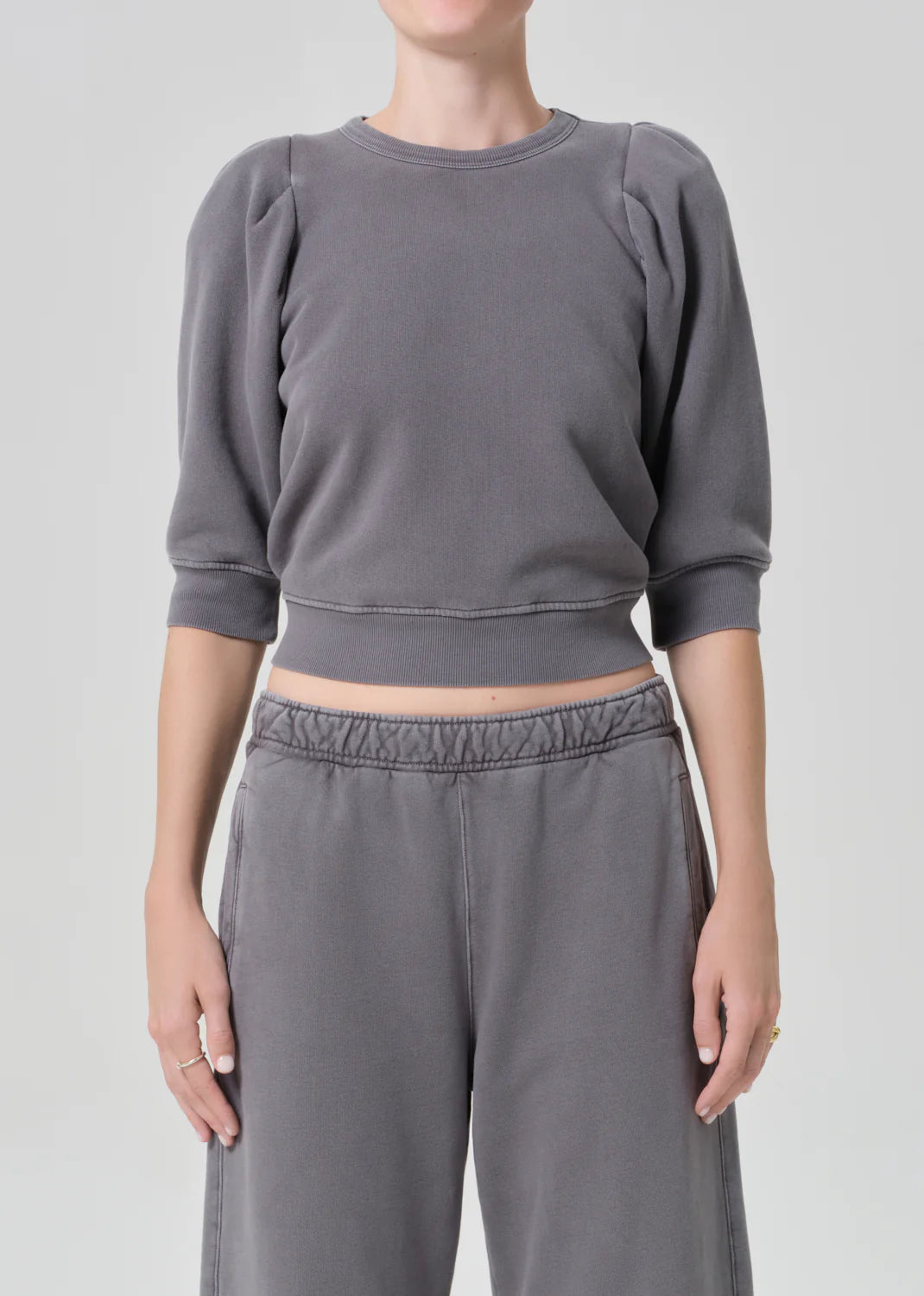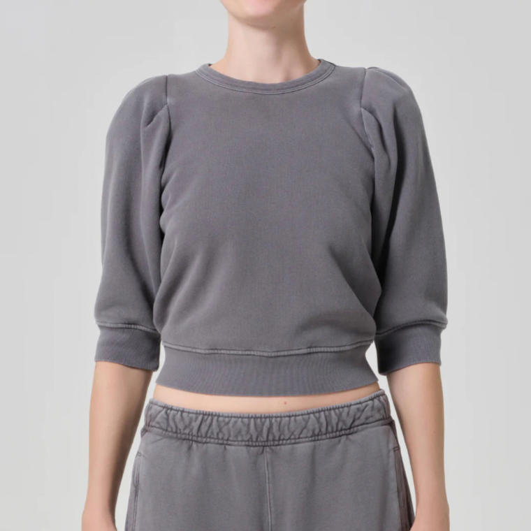 Looks Like: Medium to dark grey puff pleated short sleeve crewneck