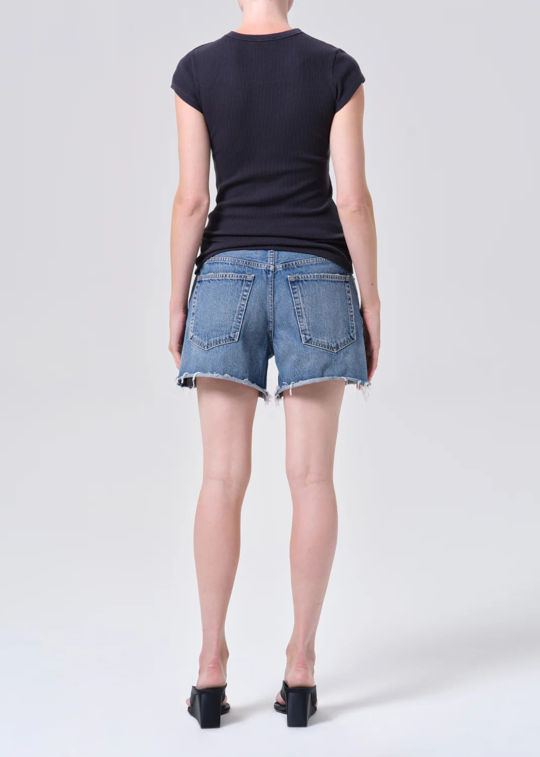 Our most relaxed short, the Nye is designed with a loose, low-slung fit and a subtle drop crotch for a true borrowed-from-the-boys feel. Rendered in a medium classic washed indigo, it features raw hems and generous five-pocket detailing, giving it an easy, authentically vintage attitude. Meant to be worn low on the hips, this silhouette delivers a laid-back, effortlessly cool look every time. Crafted from rigid non stretch 100% regenerative cotton denim with a soft hand feel, it offers all-day wearability while maintaining its crisp, structured shape.