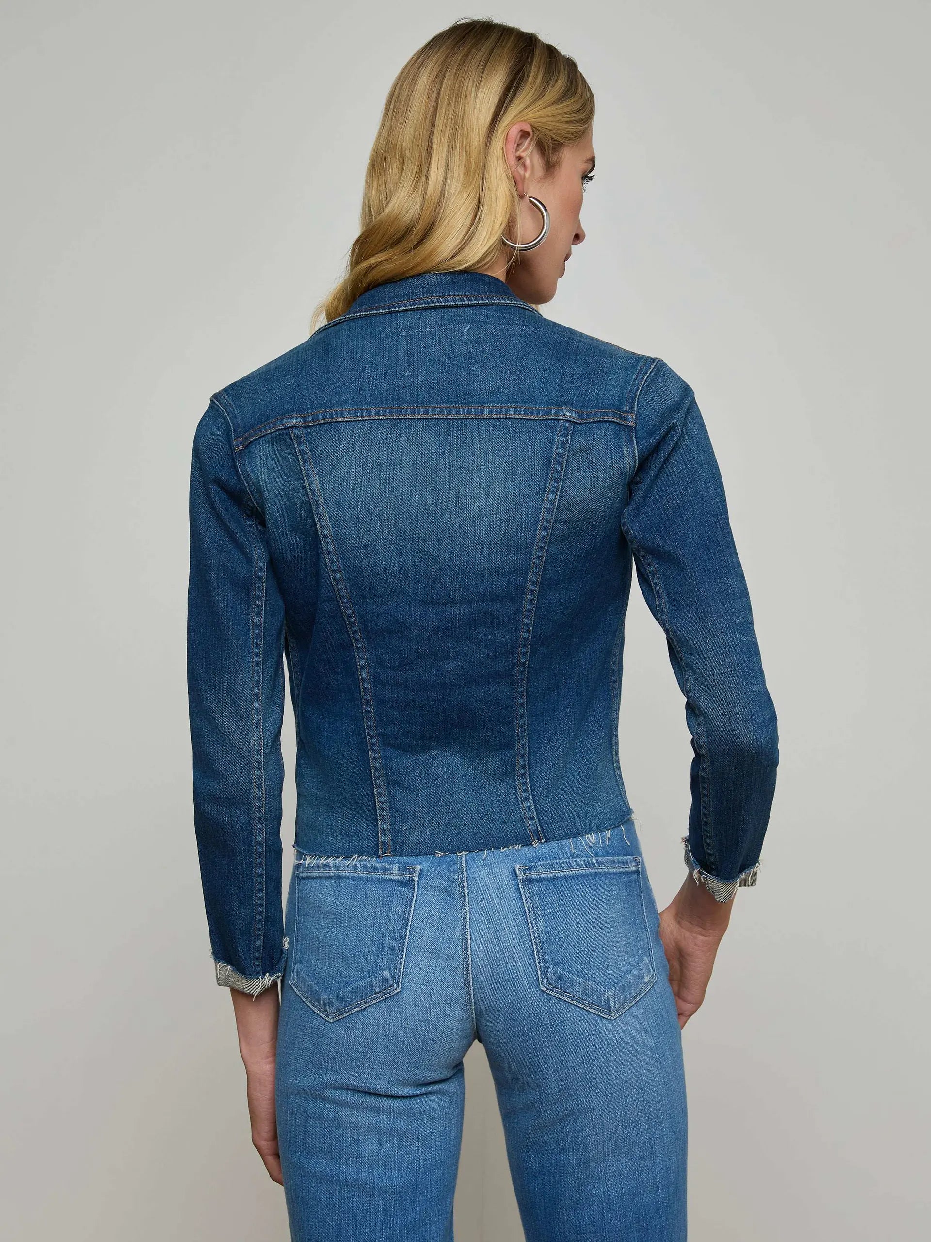 A vibrant blue denim jacket with a feminine fit and an ultra-soft feel. Luxurious stretch denim hugs the body while allowing complete freedom of movement. Timeless design features a classic collar, double chest pockets, and a front button closure. Slimming tapered seams and a raw, ravaged hem add a modern edge.