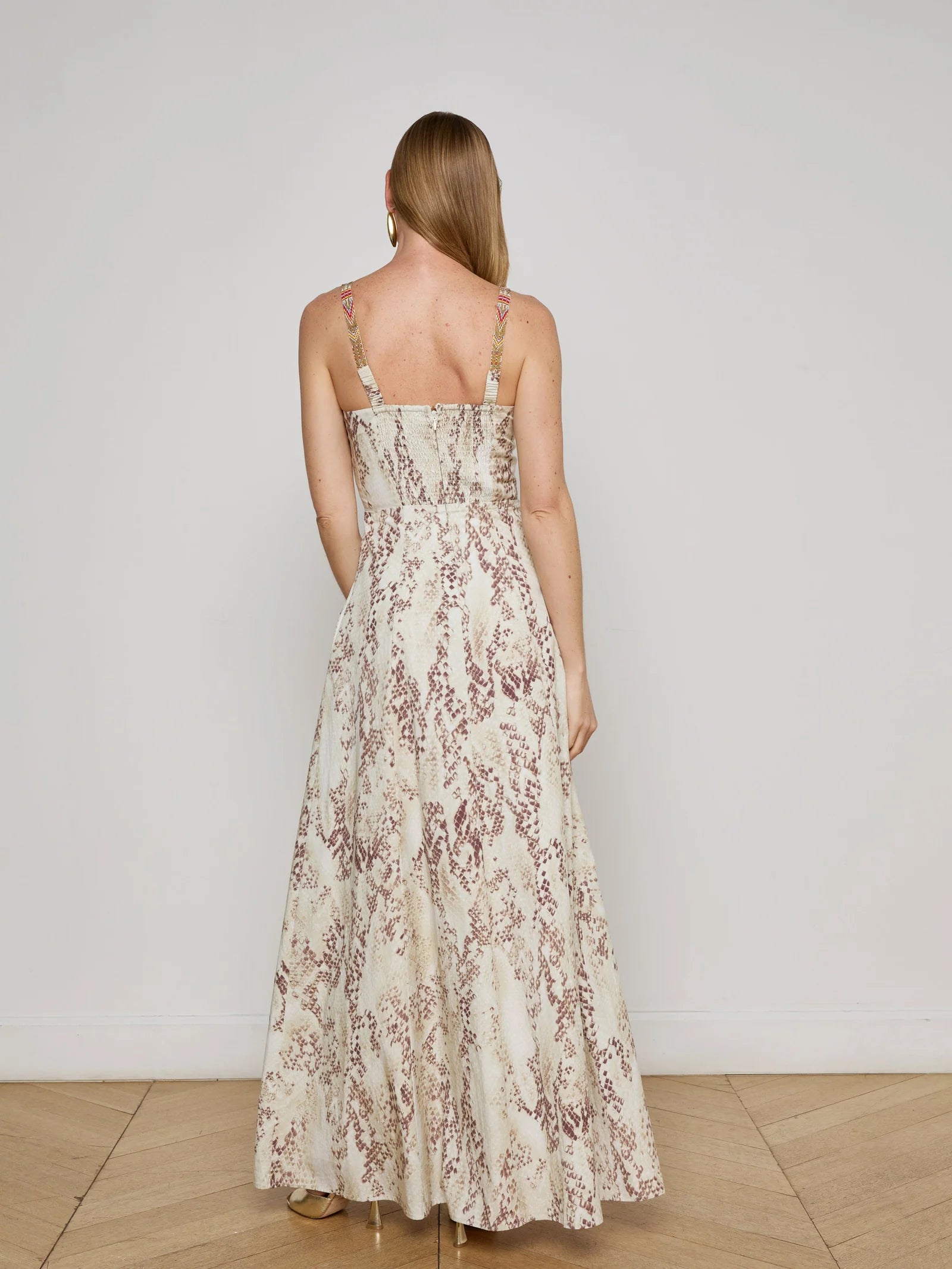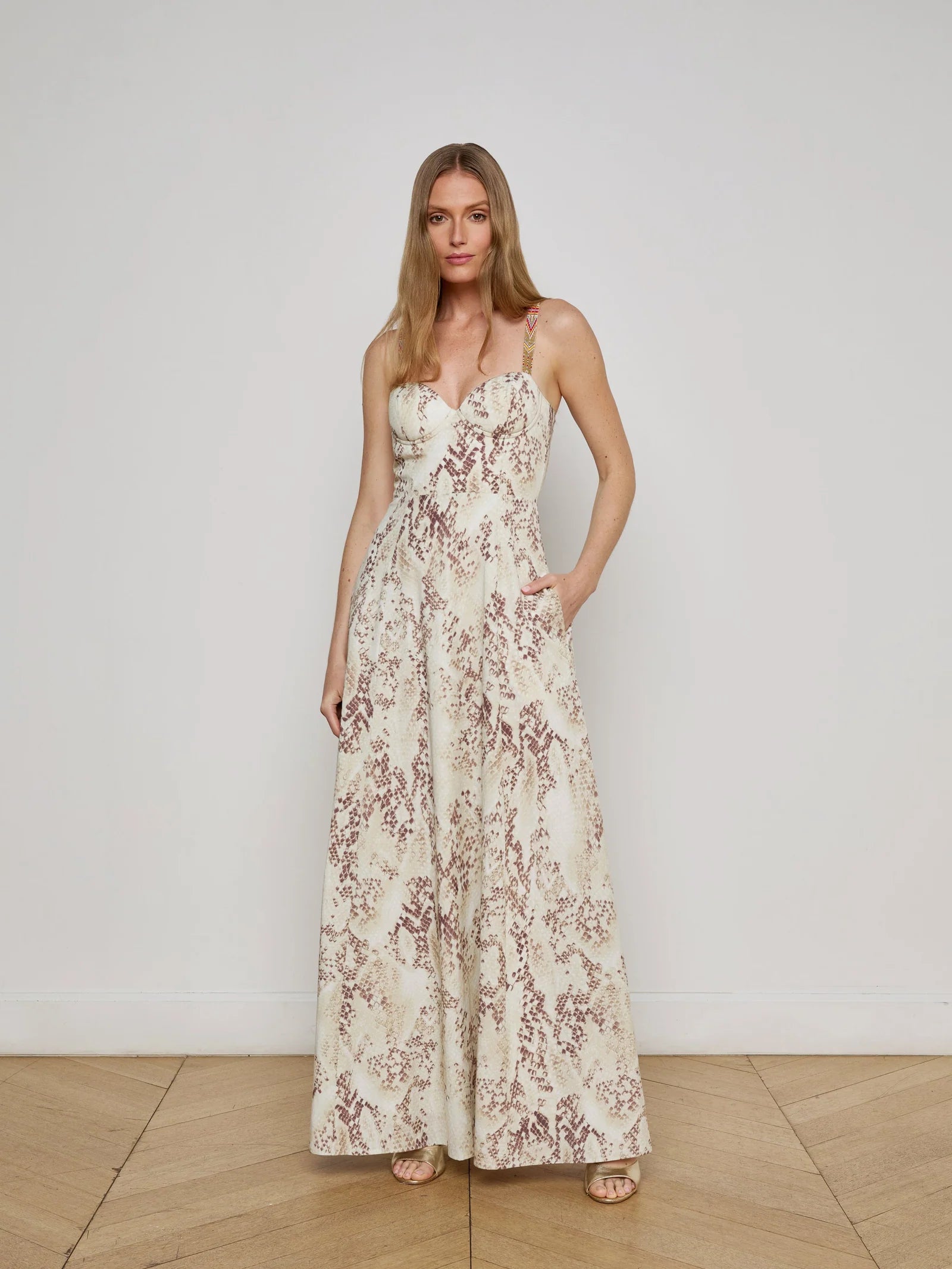 Make a statement in this snakeskin print maxi dress, featuring underwire cups for a supportive, flattering fit and embellished straps that add a touch of glam.