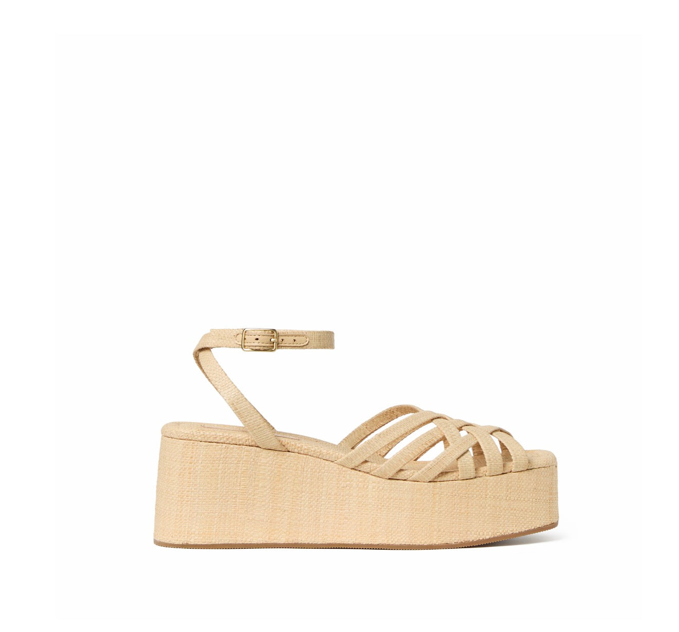 Platform sandal in natural raffia with strappy detail. Features a padded leather footbed with gold stamped logo, an open toe, and an adjustable buckle ankle strap.