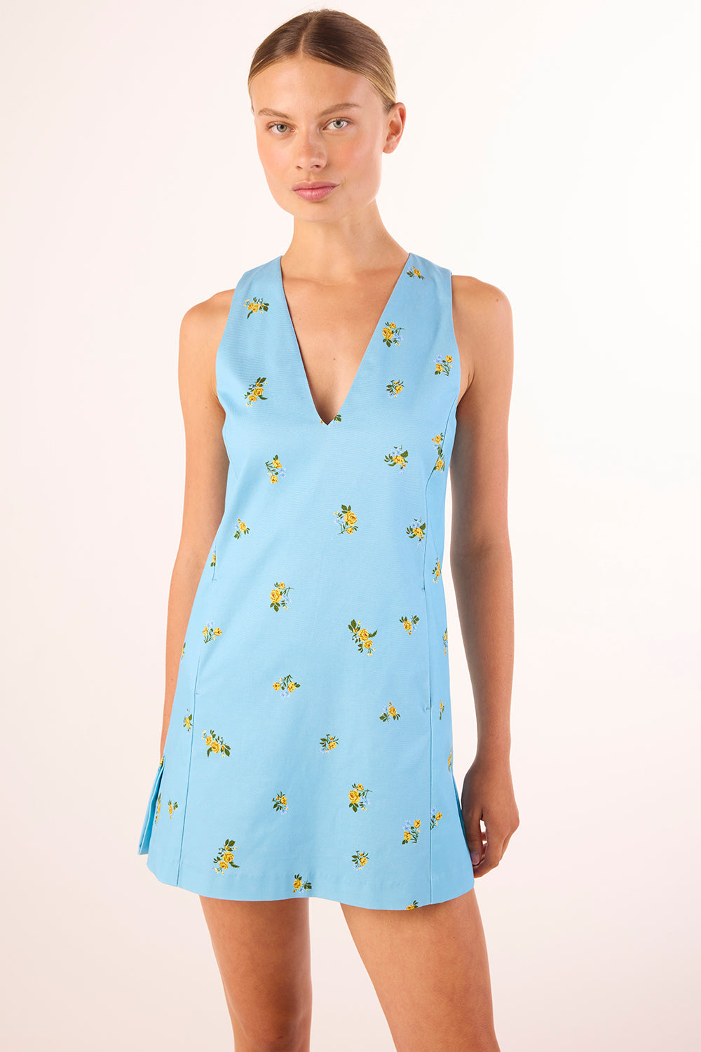 The Anise dress is a modern, mod-inspired mini shift cut from a stretch cotton blend printed with yellow ditsy florals on a fresh cornflower blue ground. Designed with a V-neckline and sleeveless silhouette, it features a hidden back zip closure, side slit pockets, and subtle darted side slits for ease of movement.