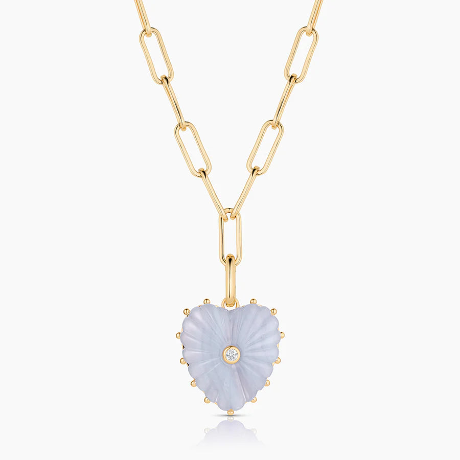 Our Malene heart charm in dreamy blue lace agate—hand-carved stone, cubic zirconia, and high-shine gold on a hinge clip for removability. Everything you want and need to make a statement.
