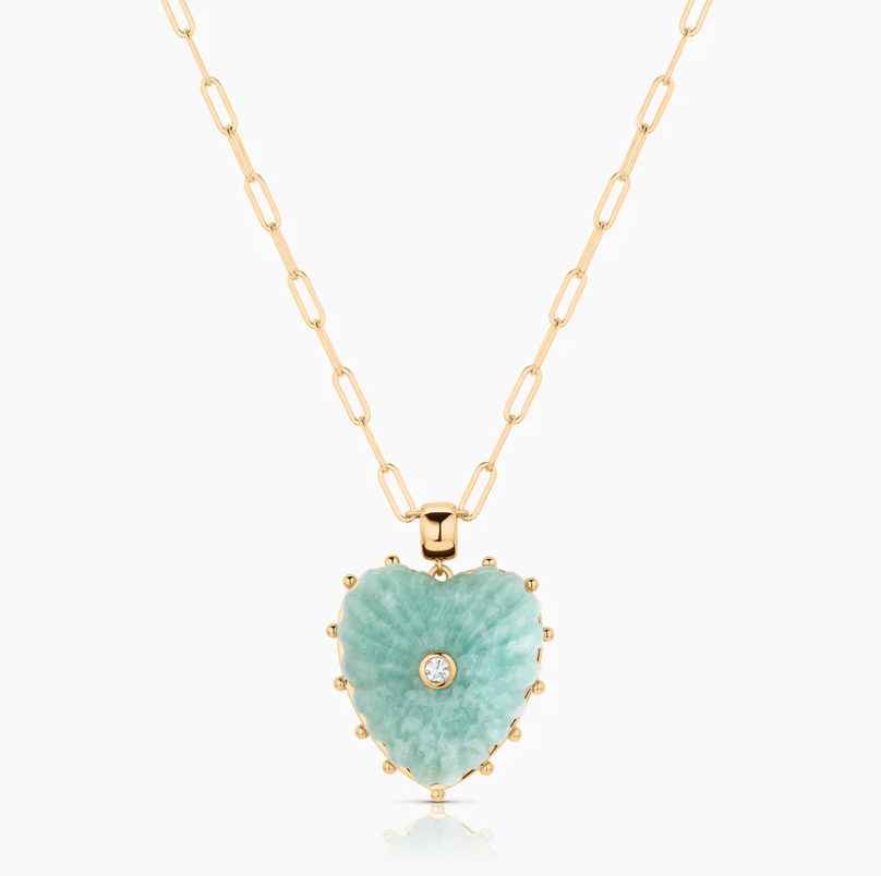 Our fan favorite Malene hand-carved amazonite heart charm strung along our modern paperclip necklace—a match made in heaven.