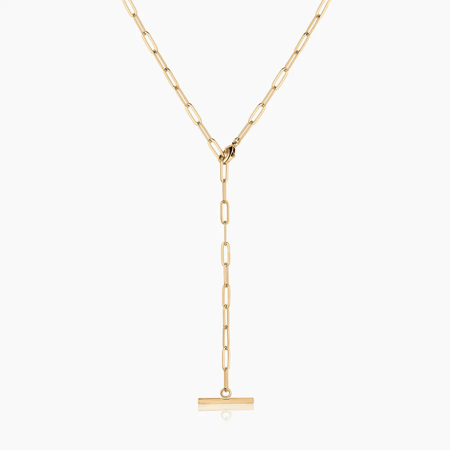 Take the paperclip trend to the next level with this luxe lariat style. Featuring a minimalist bar design, you can clasp it along any link for a customizable look. Wear it short or long, with a classic white tee or mixed into your necklace stack.