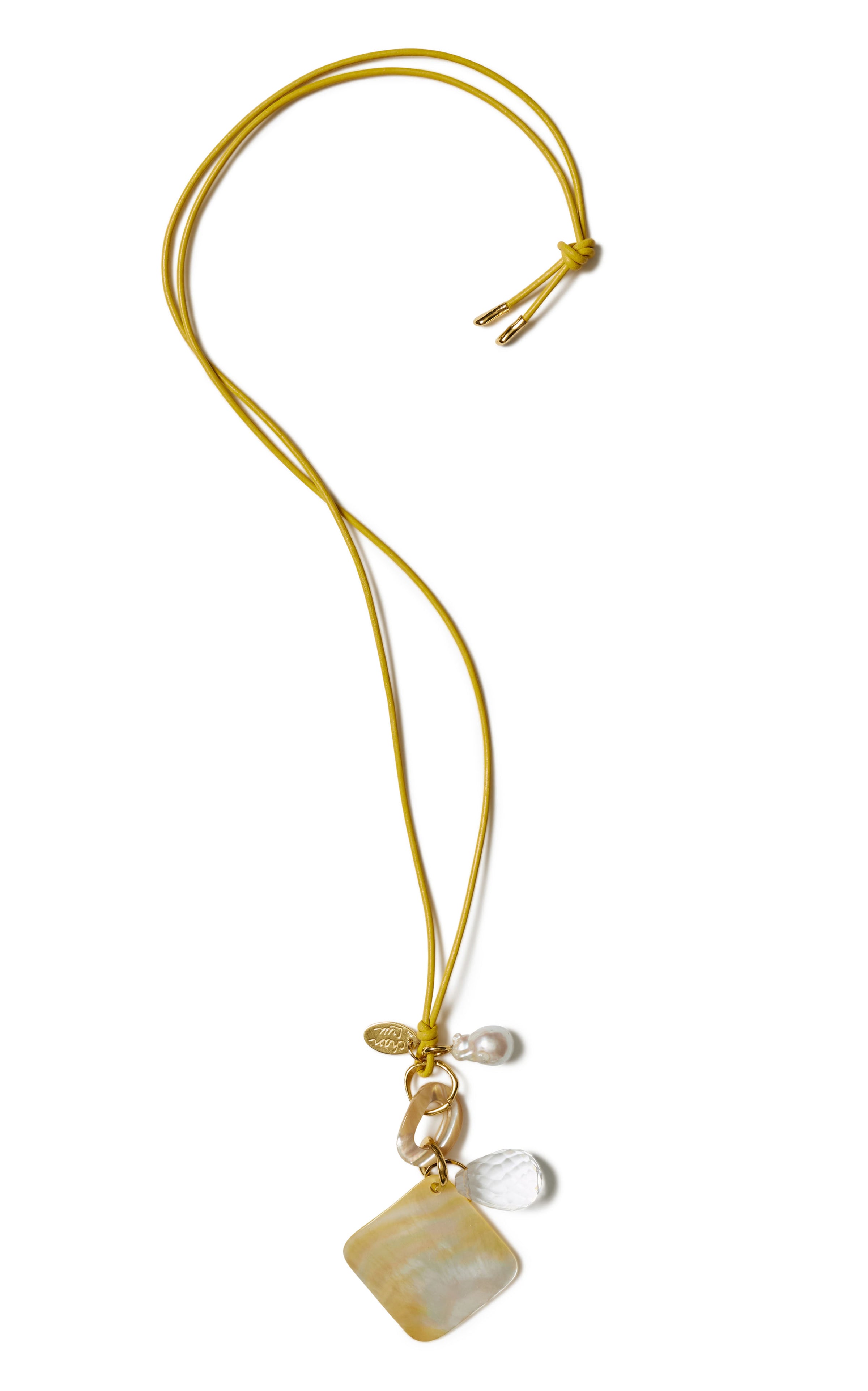 With mother of pearl, clear quartz and freshwater pearl, the Maxine Charm Necklace captures the allure of a faraway tropical island, transporting you to a place half mythic, half dreamed. Adjust the fit by tying the yellow leather cord at your desired length.