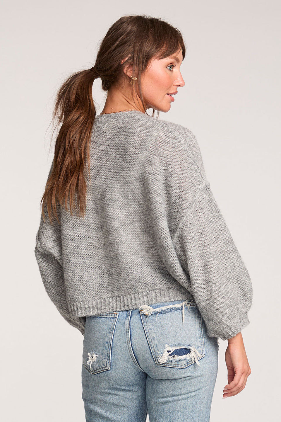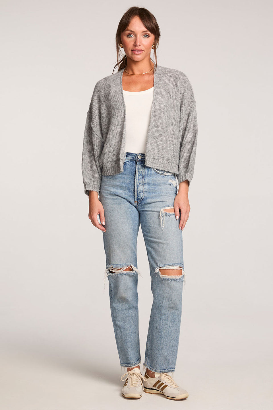 The Aden Heather Grey Sweater is a timeless classic cardigan featuring a cropped silhouette and boxy fit.