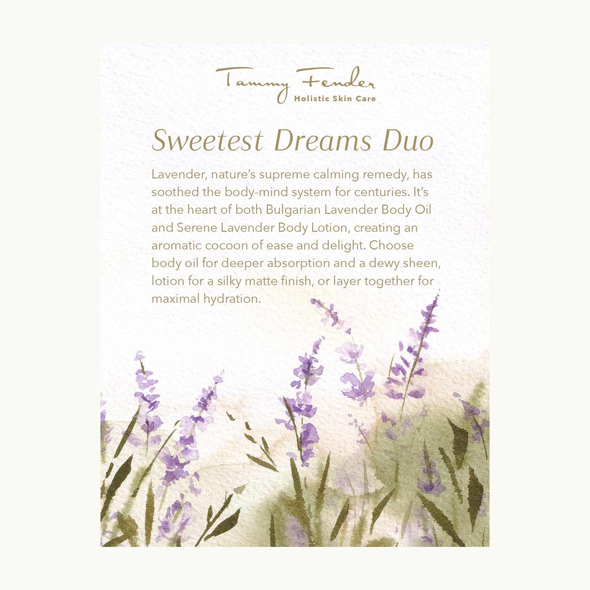 A duo with very soothing intentions. Blended with pure essence of Lavender, nature’s supremely calming remedy, both Bulgarian Lavender Body Oil and Serene Lavender Body Lotion create an aromatic cocoon of effortlessness while nurturing the skin. Reach for body oil, a golden blend of light, nutritive natural oils, to impart a soft sheen. Choose body lotion, a creamy, featherweight emulsion, blended with nutrient-rich Manuka Honey, to create a satin-matte finish. Or layer these two versatile formulas together—oil under lotion—to create a synergistic effect, amplifying nourishing and hydrating benefits.
