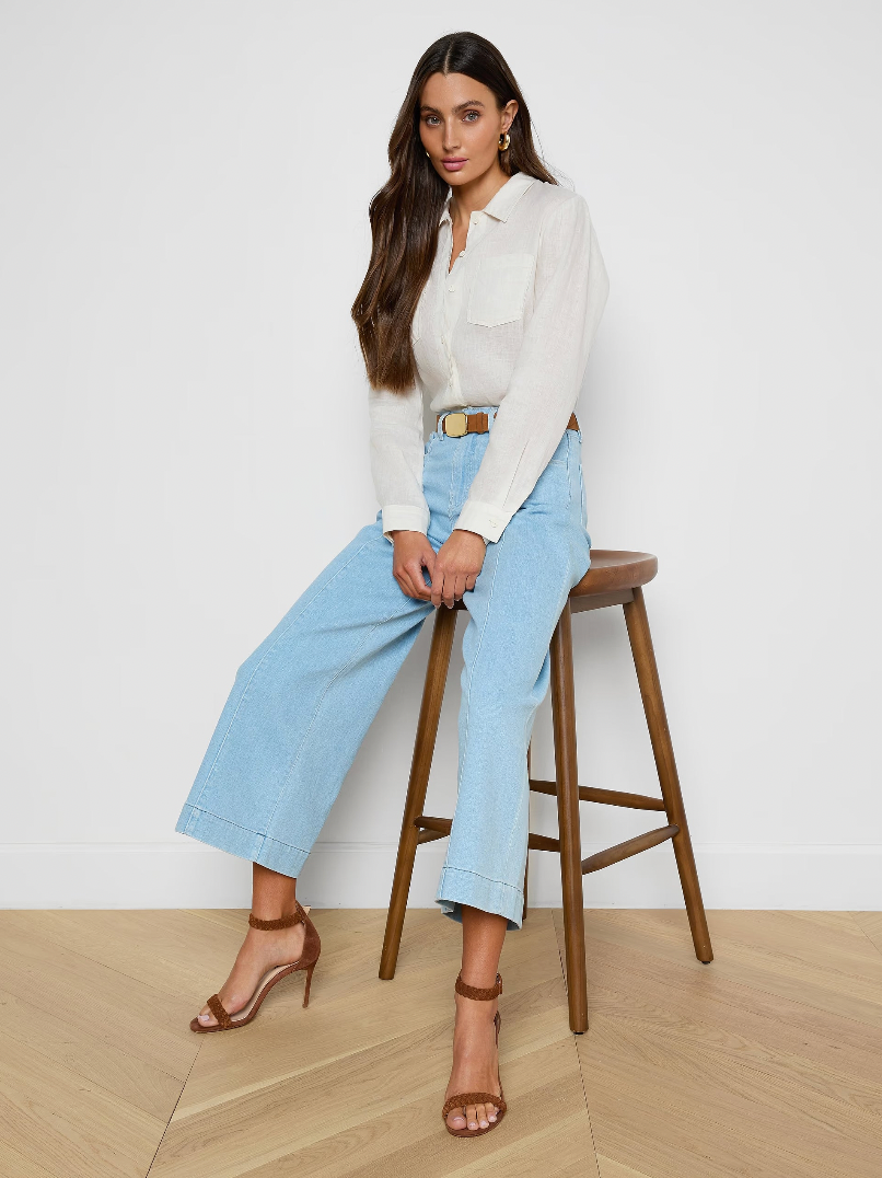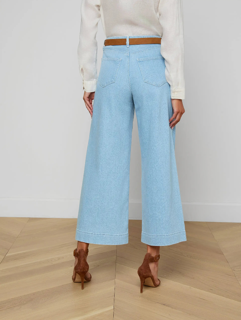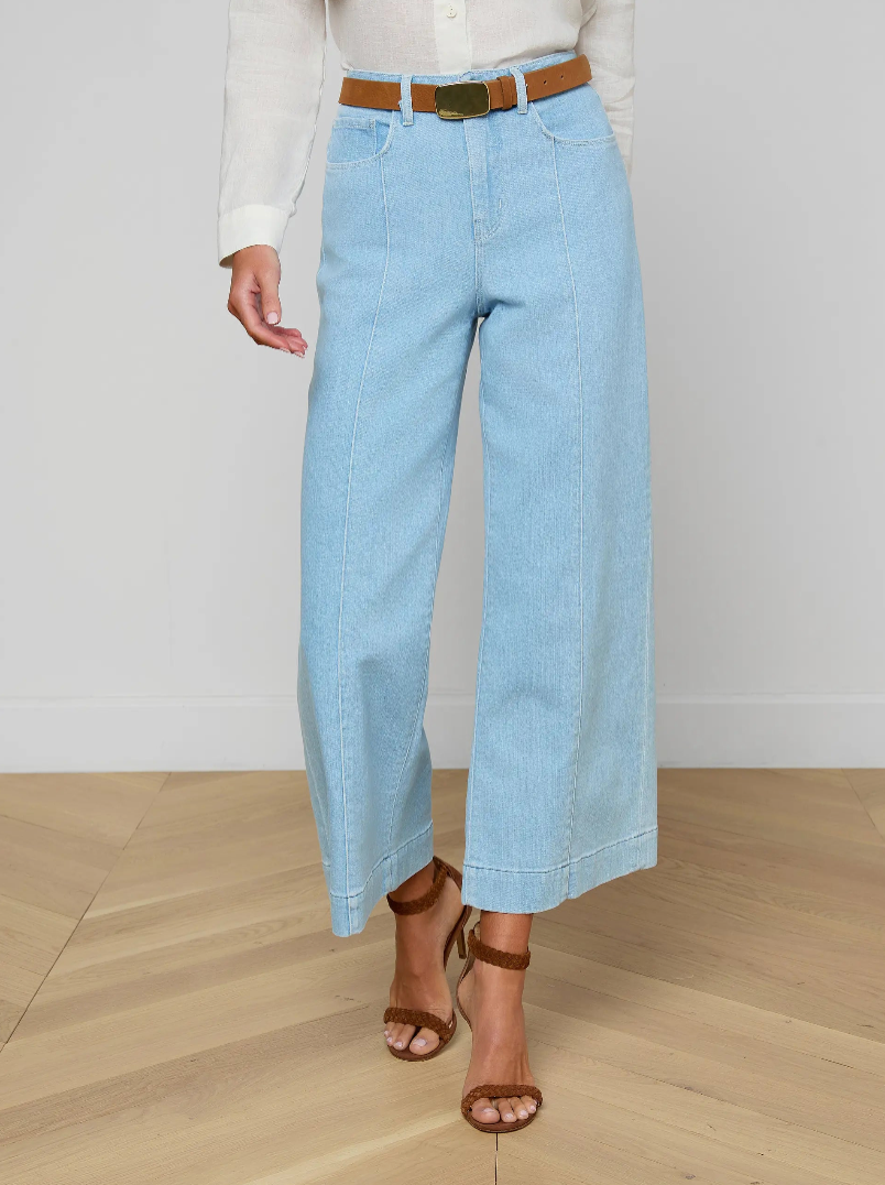 An effortless cropped wide-leg jean, defined by a center seam that visually elongates the lines and creates a legs-for-days look. Now back in a soft light wash.