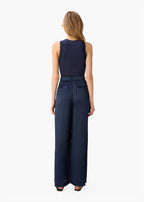 AN EFFORTLESS STATEMENT IN FLUID HAMMERED SILK. THE KYLEY HIGH RISE HAMMERED SILK PANT IN BLUE FEATURES A WIDE-LEG AND A FLAT FRONT WAISTBAND WITH ELASTIC AT THE BACK FOR COMFORT AND EASE. DESIGNED WITH CLASSIC BELT LOOPS, WELT POCKETS AT THE BACK, AND A FRONT FLY CONSTRUCTION FINISHED WITH A HORN BUTTON CLOSURE, THIS SILHOUETTE BALANCES TAILORED STRUCTURE WITH RELAXED MOVEMENT. UNLINED FOR A LIGHTWEIGHT FEEL, IT DRAPES BEAUTIFULLY FROM DAY TO NIGHT.