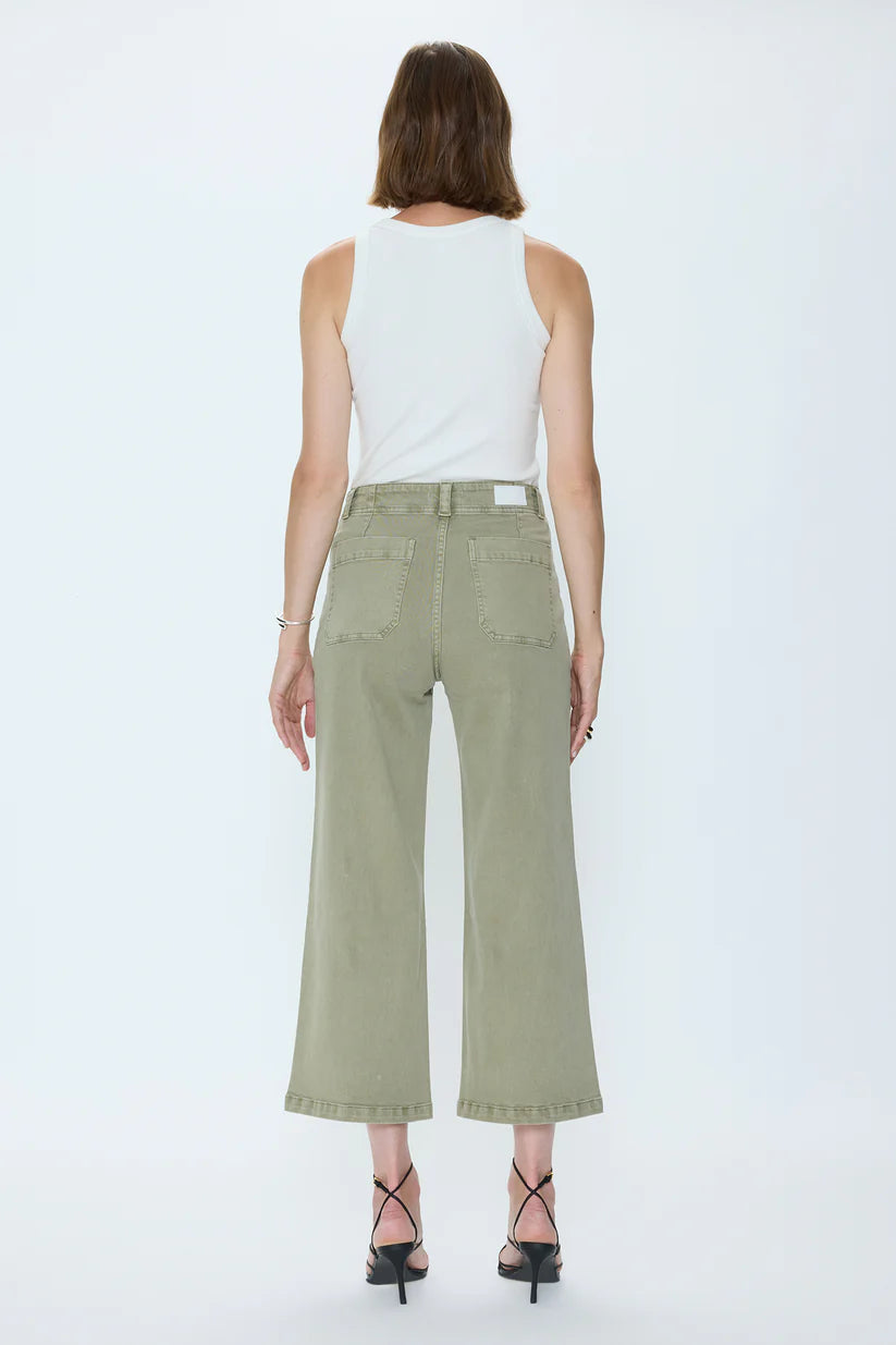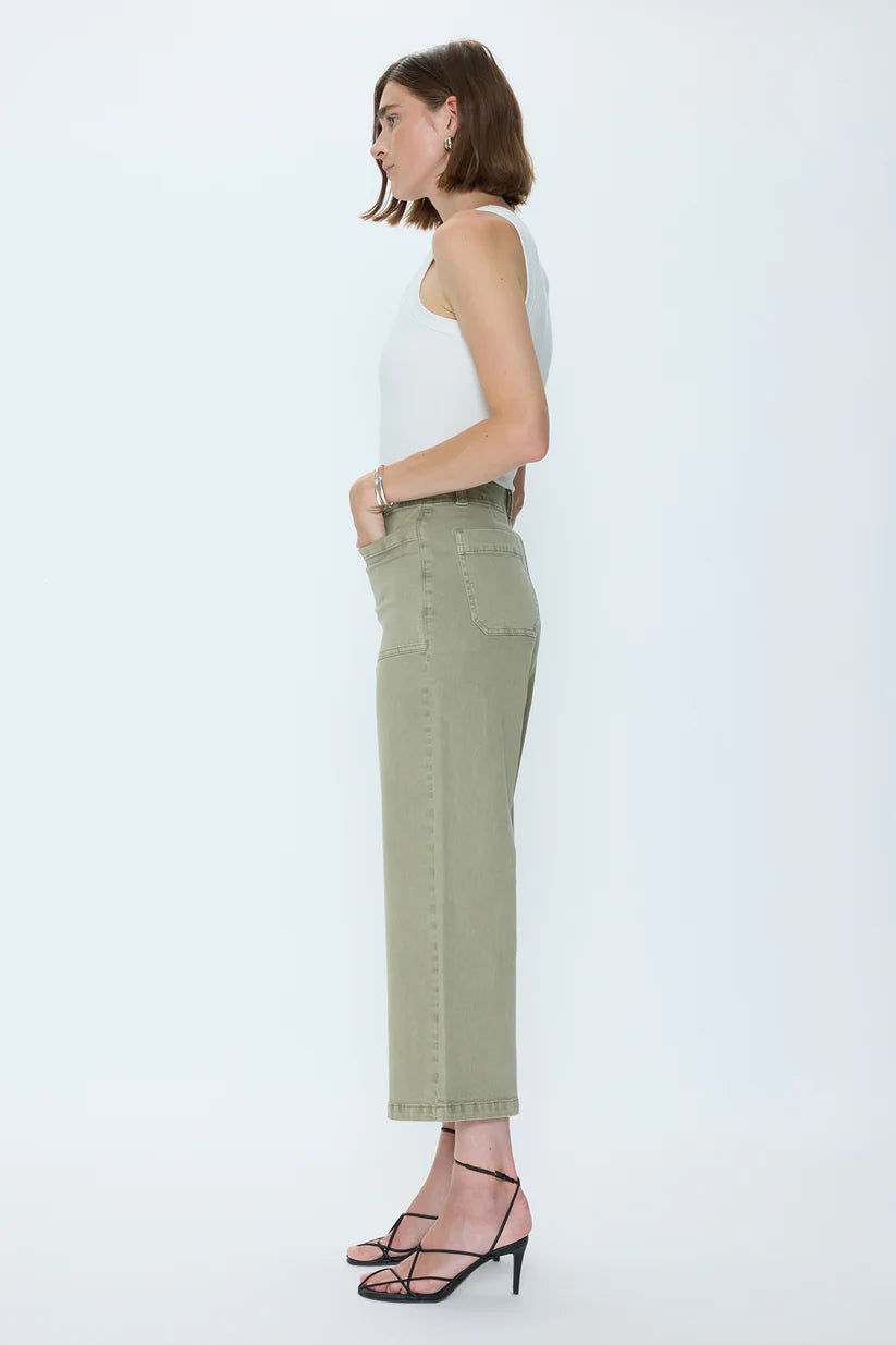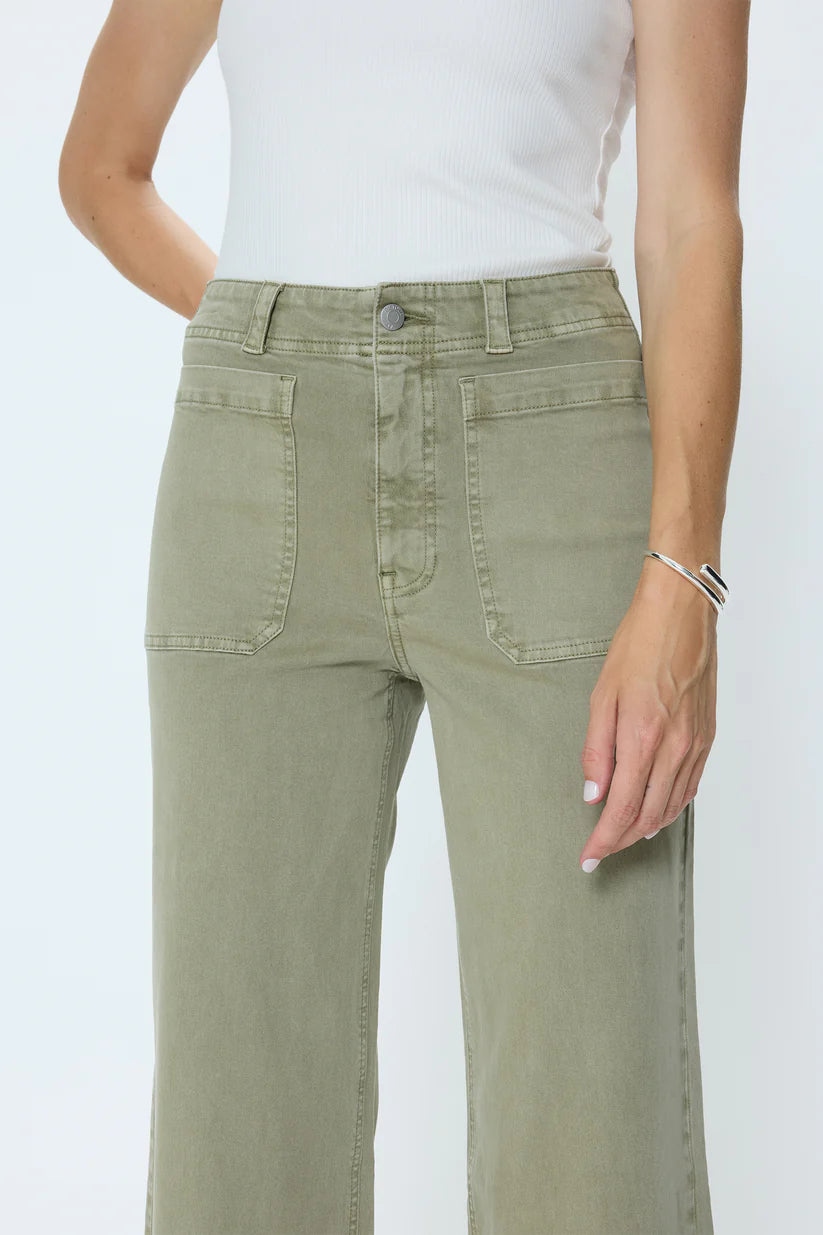 Zooey updates the classic utility pant with a high rise, streamlined straight leg, and cropped inseam that gives the silhouette a contemporary new feel while patch pockets offer practical appeal. Crafted in Slate Green, the bright white wash adds a polished contrast to the pant’s workwear roots.