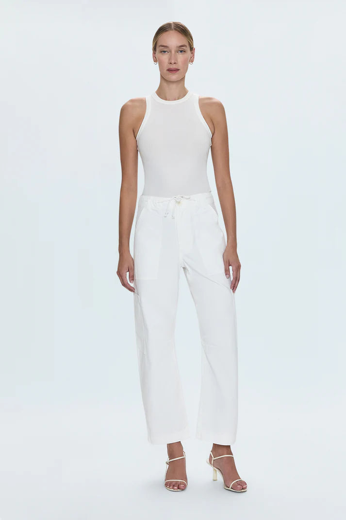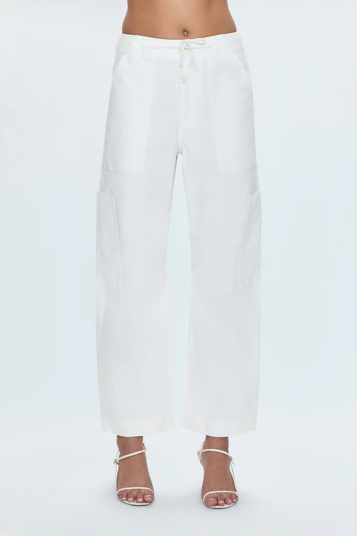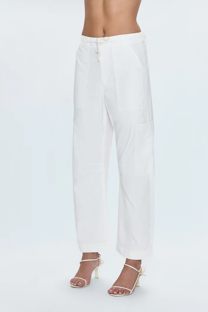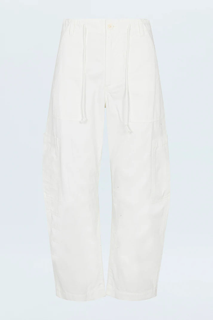 Embrace a relaxed yet refined aesthetic with the Sabrina Curved Utility Pant. These pants are meticulously designed with a subtle bowed leg shape, creating a unique and modern silhouette that sets them apart. Crafted from a durable non-stretch twill, they offer a structured feel that maintains its shape throughout the day. The hidden waistband tie allows you to customize the fit for ultimate comfort, while the strategically placed utility pockets provide both style and functionality. Perfect for your off-duty days, these pants effortlessly combine practicality with a chic, contemporary edge.