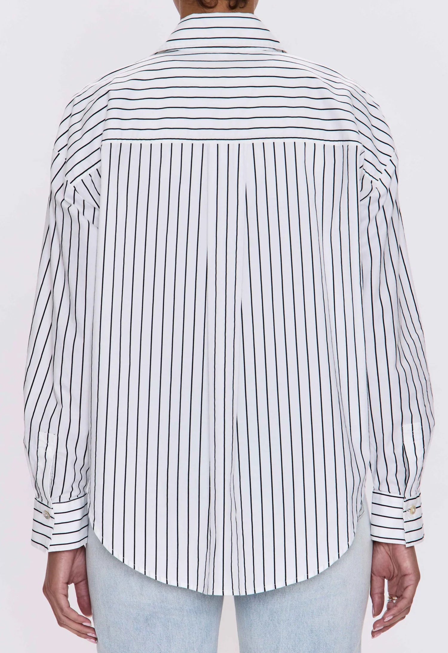 Relaxed button up shirt with a boyfriend-inspired fit and feel. Front button chest pockets, collared neckline, and cuffed sleeves. Offered in a classic oxford white decorated with black wide vertical striping.