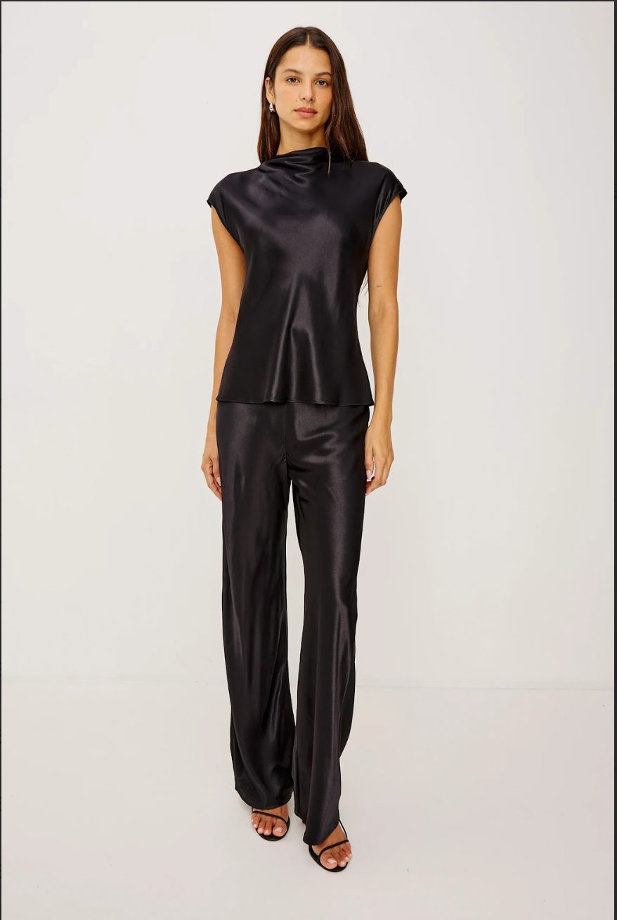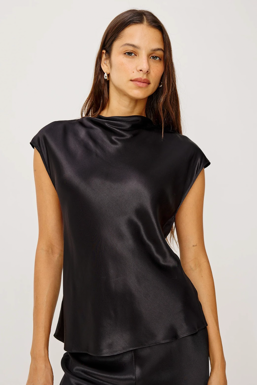 A dance of drape and detail, the Loretta glides with a luxuriously silky hand-feel and lustrous sheen. This day-to-night top features a cowl neckline, cap sleeves, and a buttoned keyhole back cutout.