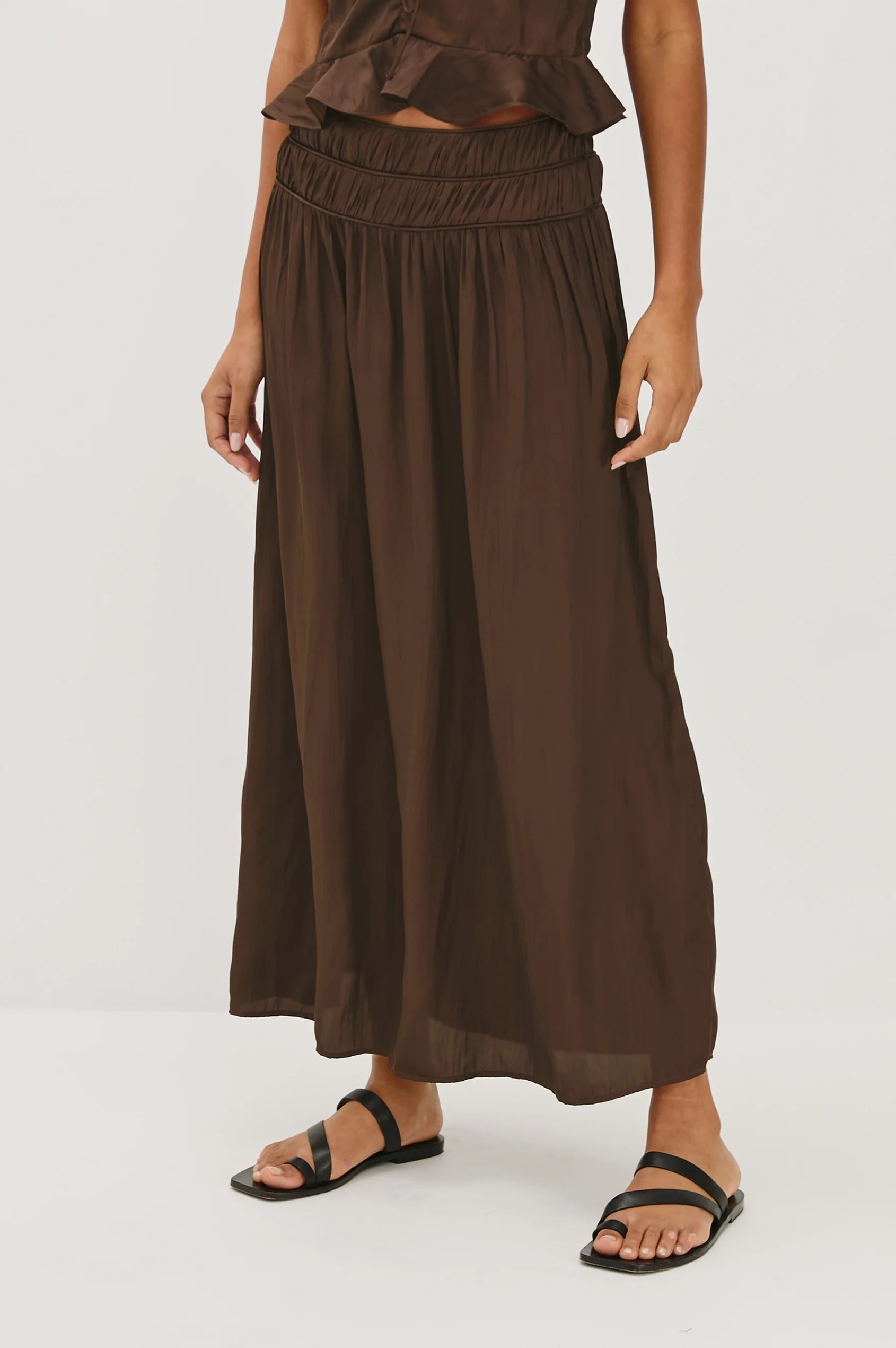 Breezy and endlessly wearable, the Nara Skirt is your go-to for warm days and easy layering. Made from a lightweight, crinkled fabric in a rich cocoa tone, it features a comfortable smocked waistband and a relaxed flowy silhouette that moves with you. Pair it with our matching Ortona top for an elevated event, or with a simple tee or linen button-down for a more undone vibe.