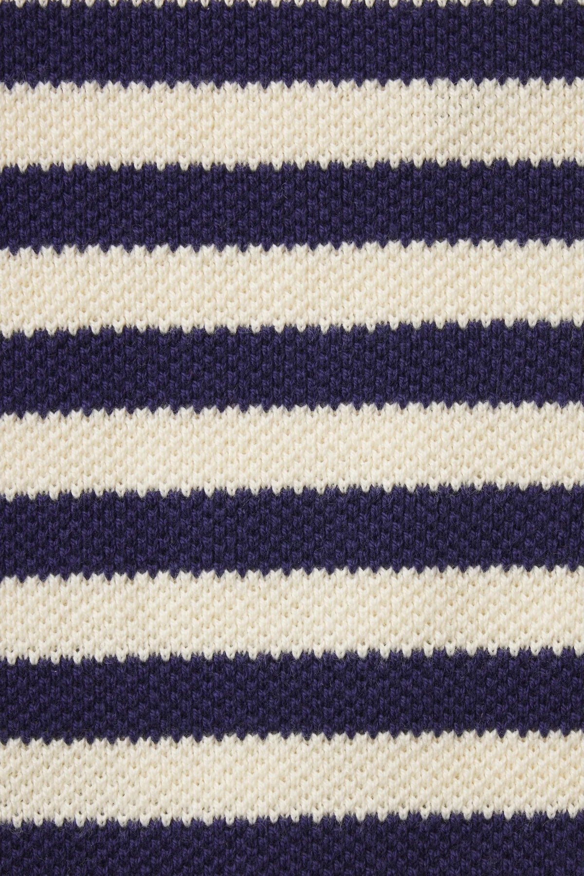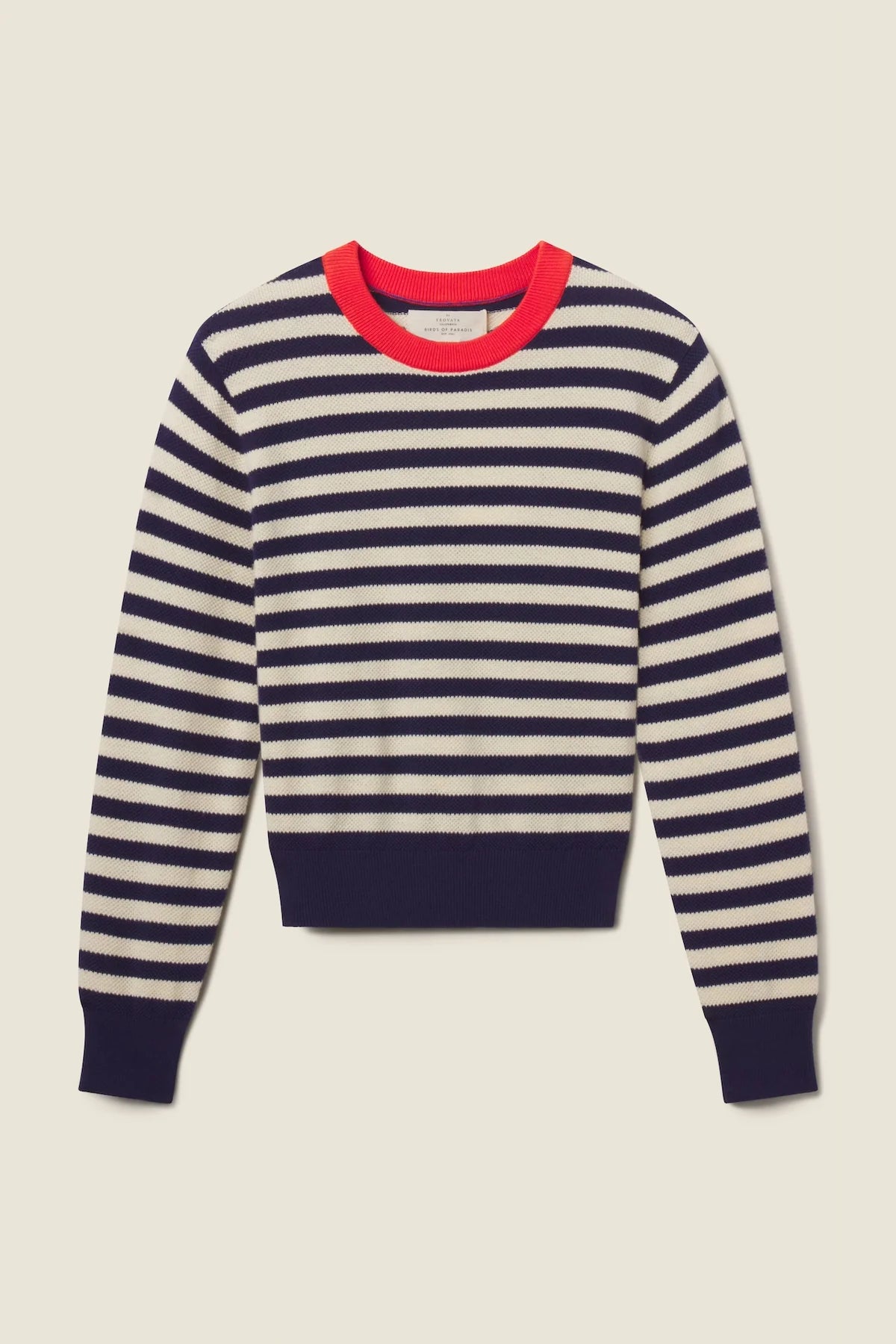 The Cleo Sweater is our classic knit sweater. Complete with alternating yarn-knit stripes and contrasting ribbed cuff and bottom hem. Shown here in Antique White/Navy Stripe and made from our soft cotton.