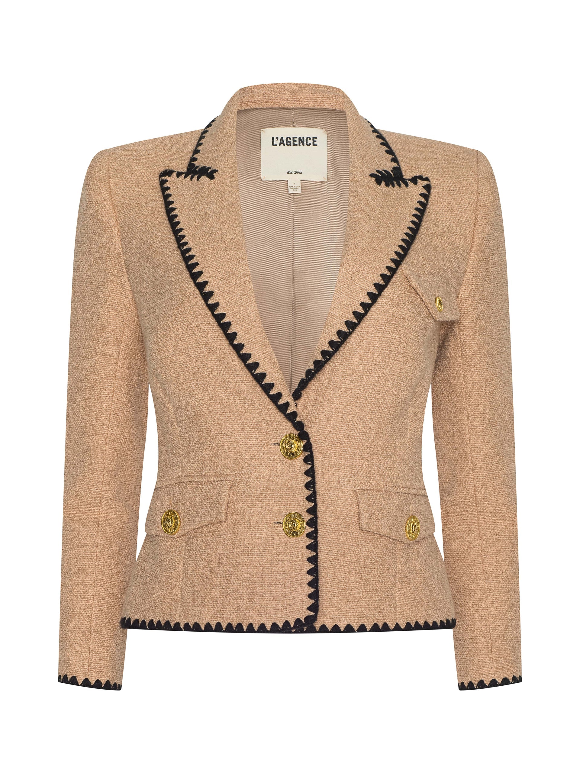 The perfect tweed blazer in a timeless neutral tan. Contrast between the slub tweed and embroidered trim as textural intrigue to this sophisticated classic. Designed with structured shoulders and a close, fitted cut, the Wylla blazer is a must-have for all seasons.