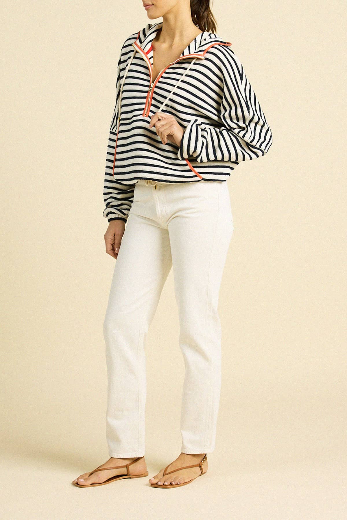 The Andi Windbreaker is our take on the classic pull-over windbreaker. With a water-resistant exterior and half-zip front with matching hood, this jacket will keep you dry and provide some wind protection. Complementary trim in red is added along the hood and pockets. Shown here in Navy Stripe and made from our terry cotton