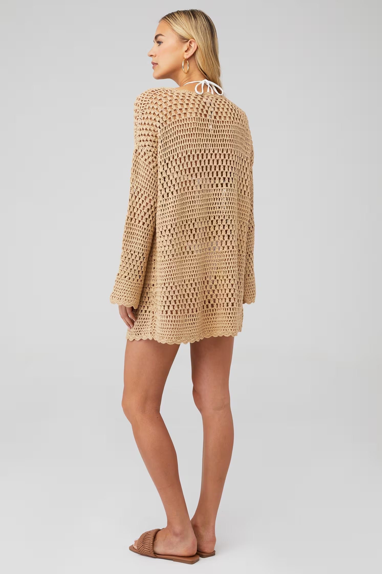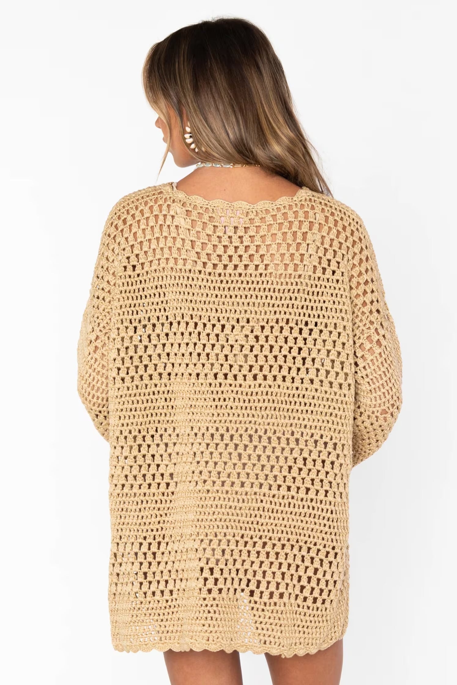 Feel chic in this tan crochet pullover! Wear the Paula as your new favorite swim coverup or throw it on over a tank for an easy warm weather look.