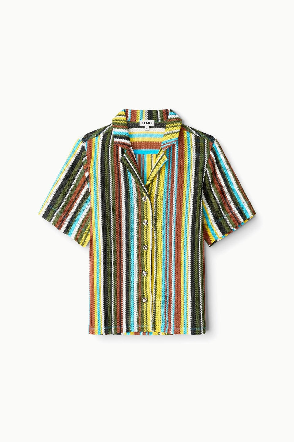 Breezy and versatile, the Gabi shirt features an open crochet knit with a classic collar and button-down front. Perfect as a layering piece or lightweight coverup.