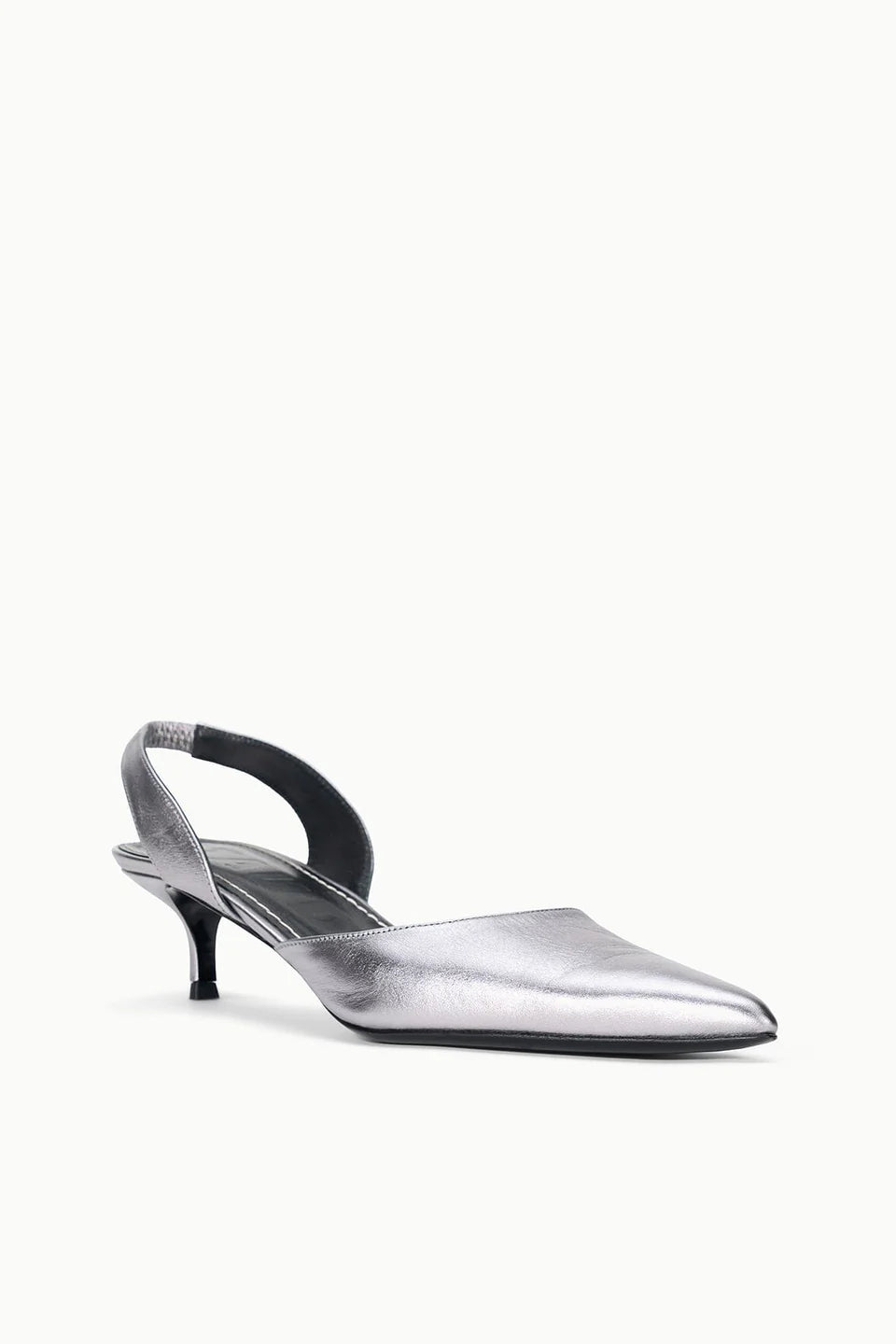 The Sebastian is a metallic leather slingback heel with a pointed toe.