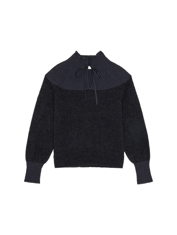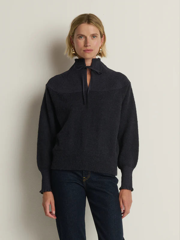 One piece you’ll never want to take off—the Babette Sweater, a luxe layering essential made of brushed Caraveli alpaca in a relaxed pullover fit. A funnel neck, bishop sleeves, smocked cuffs, and a contrast-woven yoke add soft volume and gentle warmth. These details do it all.