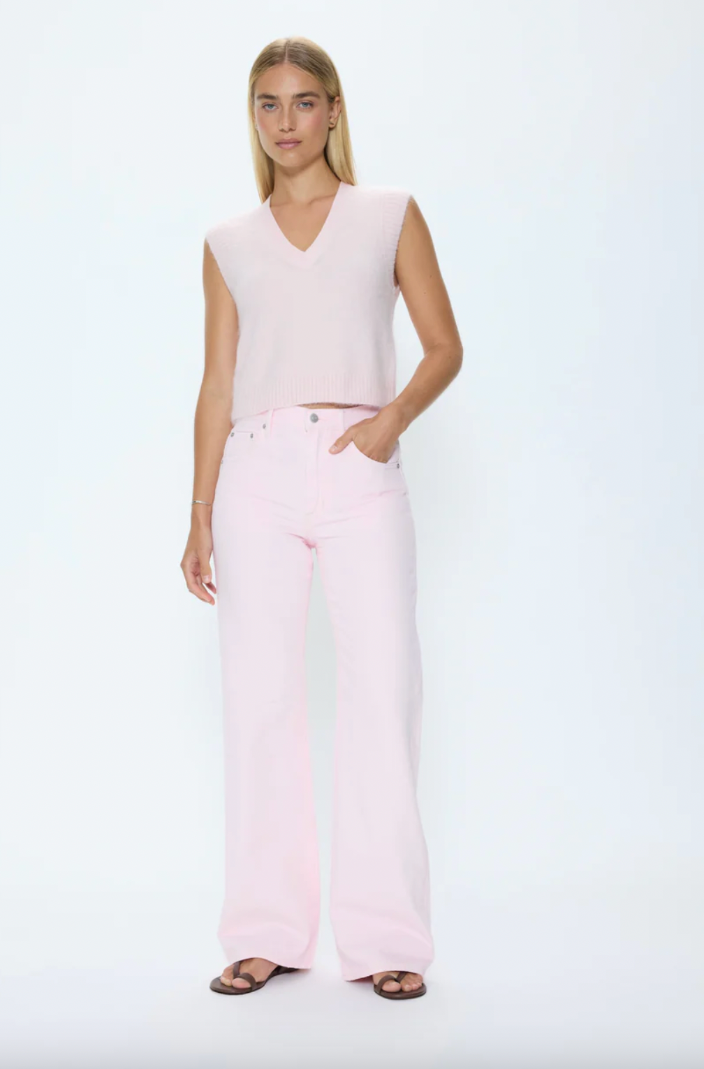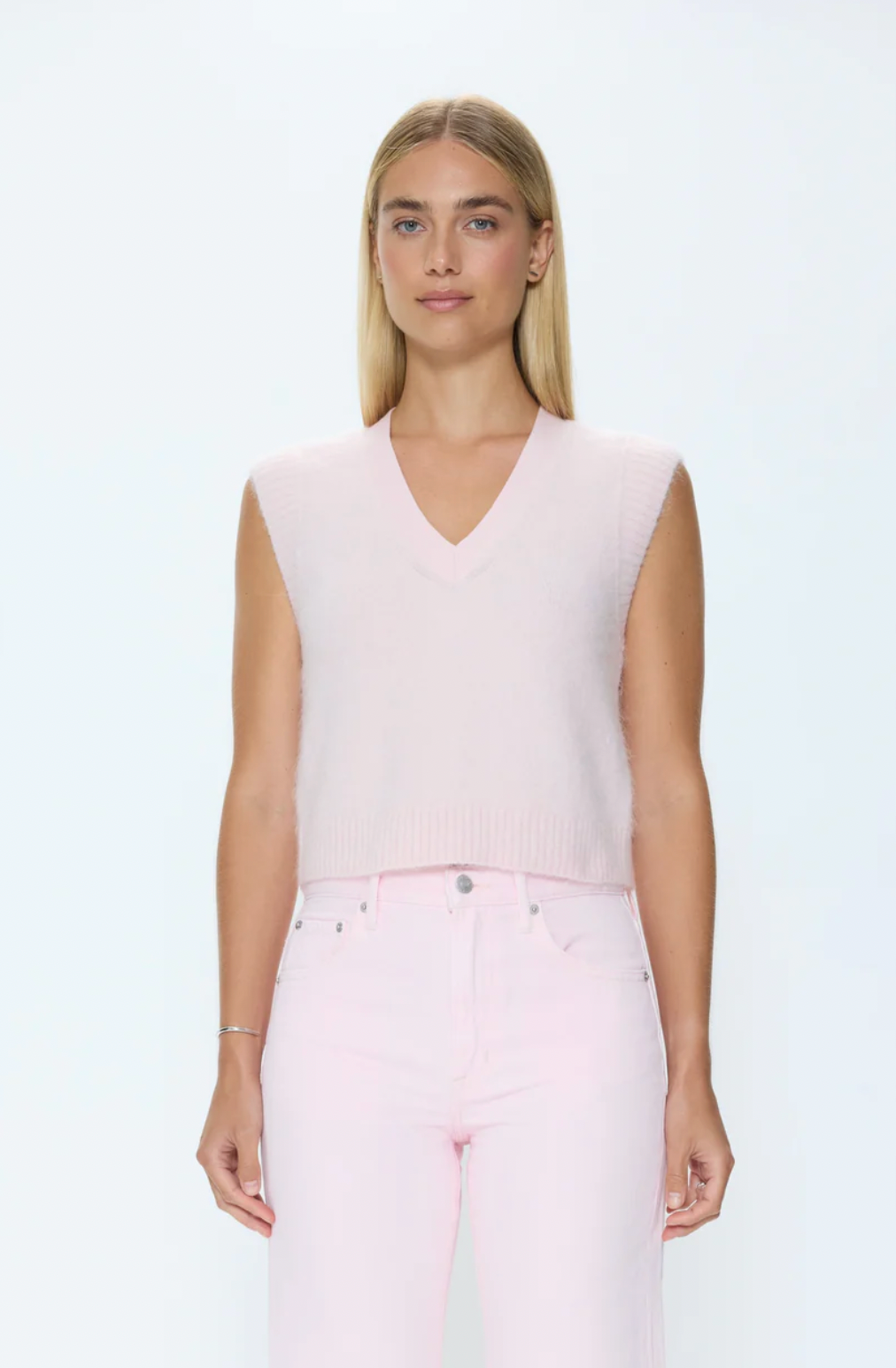 Maxine modernizes the classic sweater vest with a sleeveless, slightly boxy fit for easy layering. Crafted from a soft knit in a bright blush color, it brings a subtle pop of color and elevated texture to everyday wardrobes.