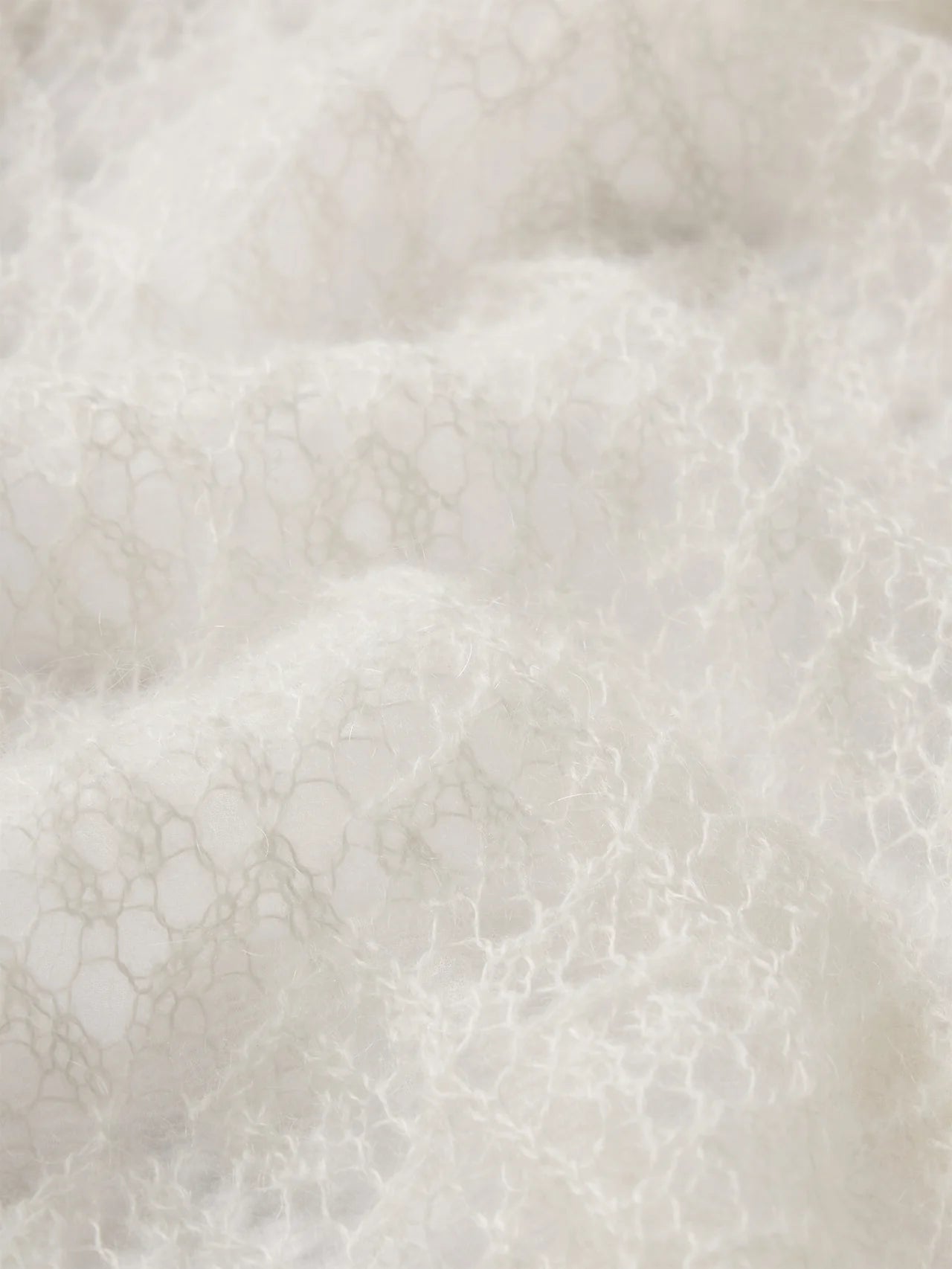 The Delicate Tie Sweater is crafted from a light mohair-wool blend with an airy, sheer finish, featuring diamond stitch detailing and a soft tie closure at the neckline for a refined, feminine look.
