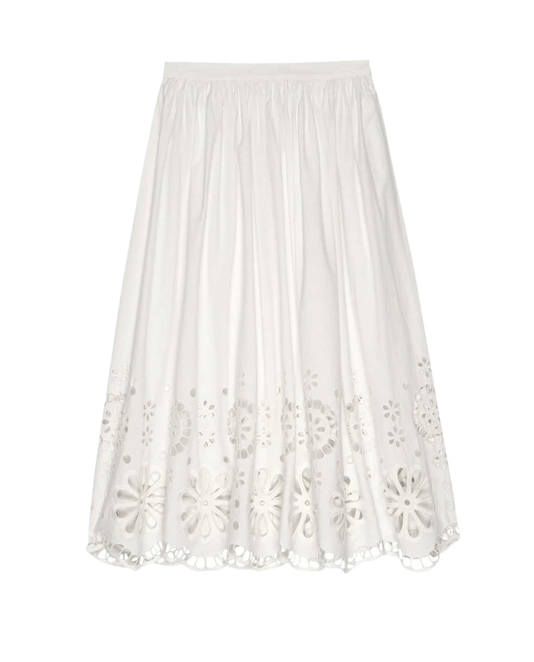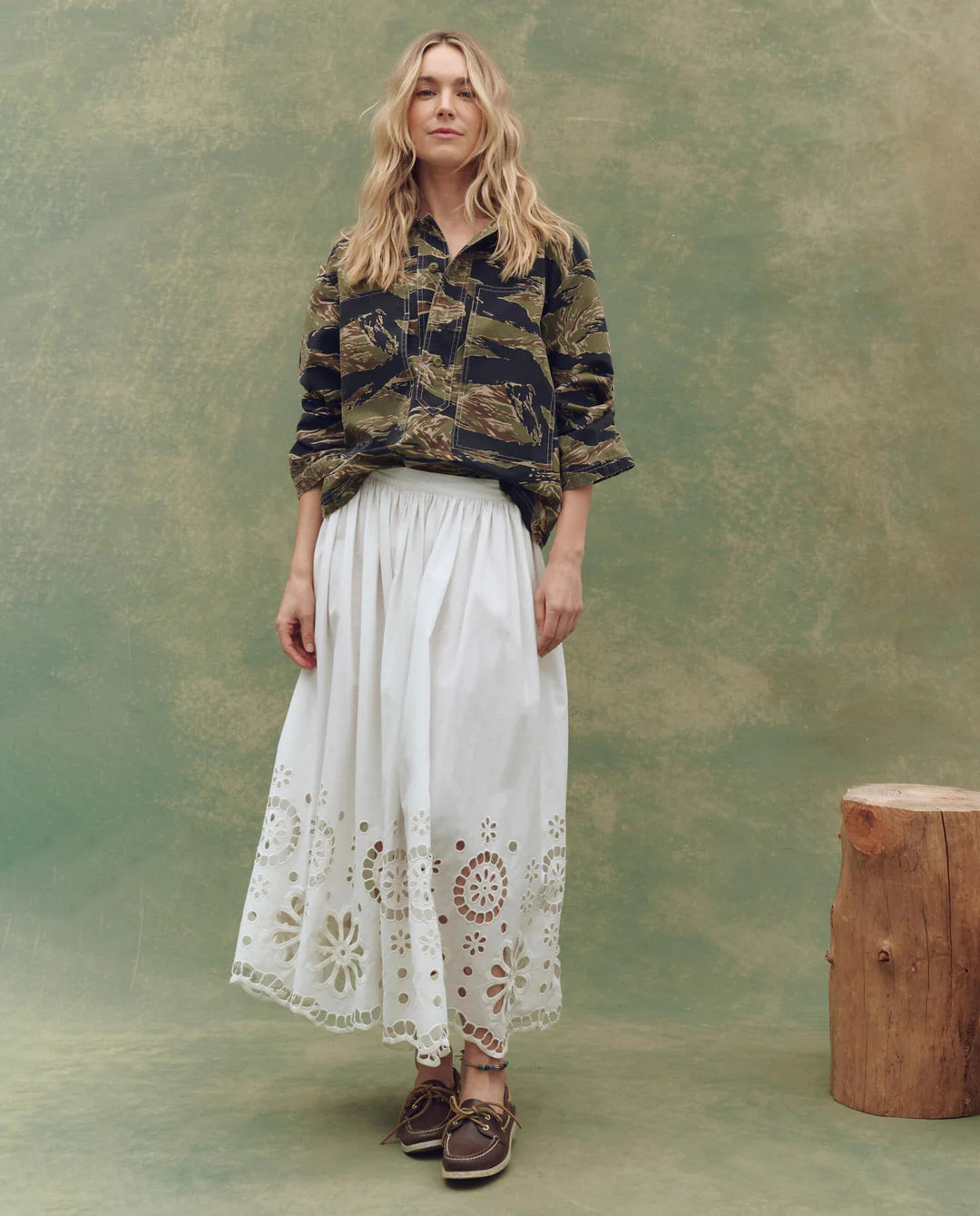 The Super Bloom Eyelet Skirt feels like something pulled from a linen drawer- storied with time. Full and voluminous, it features graphic floral eyelet cutouts inspired by Victorian handkerchiefs and antique linens, thoughtfully placed along the hem. The skirt sits at the waist with a fixed waistband and a metal zip closure at the back. Midi length with a soft, structured shape — it pairs beautifully with the matching Super Bloom Eyelet Top for a head-to-toe set that’s equal parts nostalgic and refined.