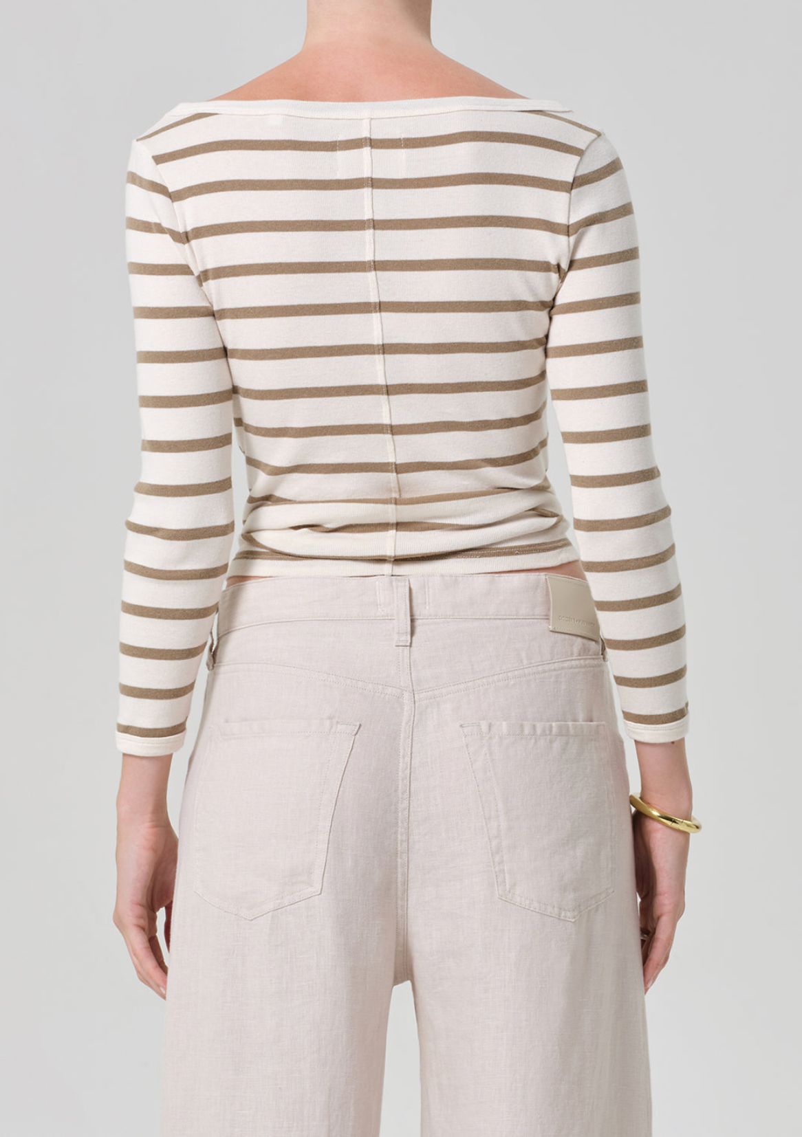 Looks Like: Cream and bronze long sleeve boat neck slim tee