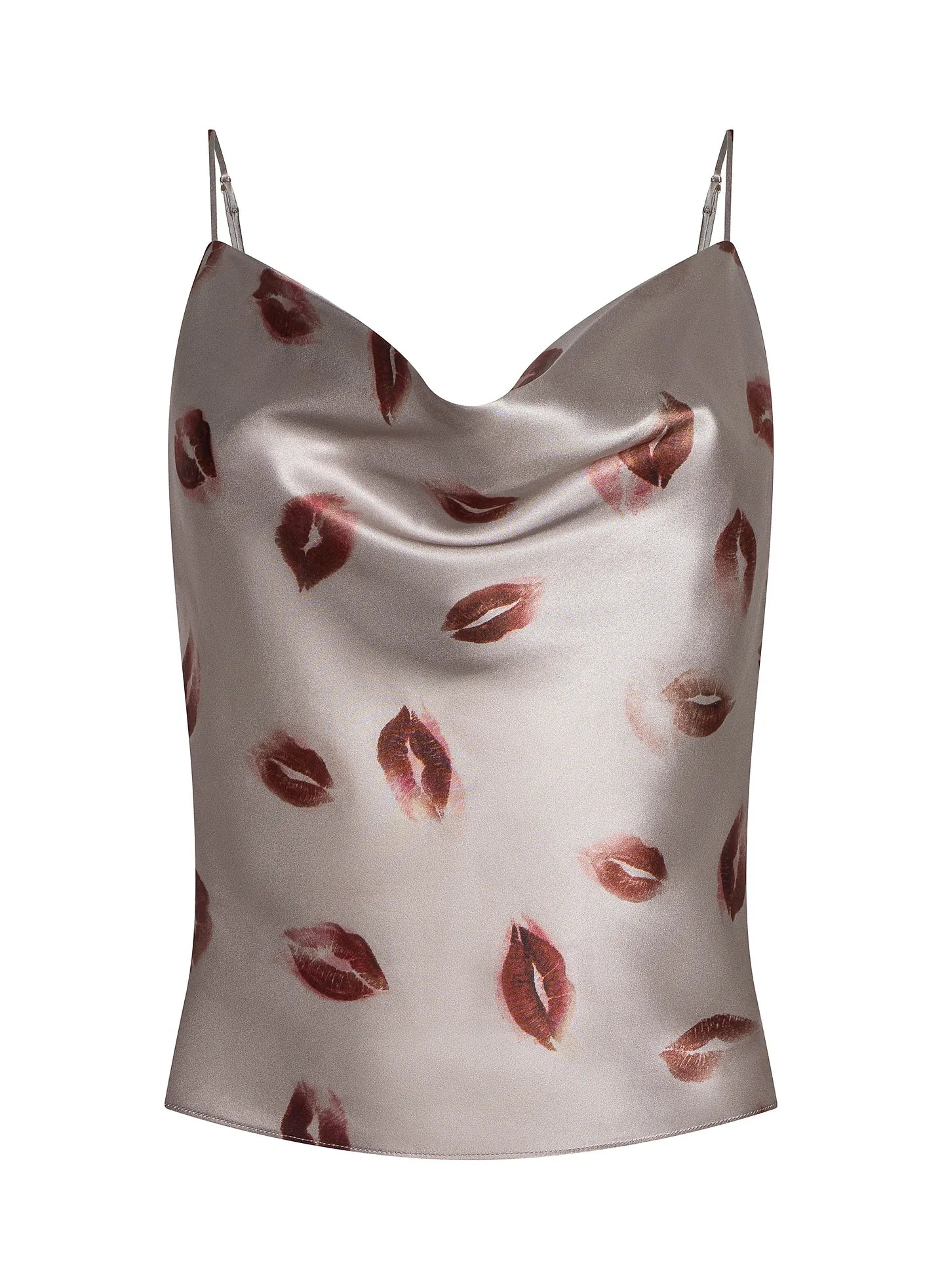 The Calista camisole is a closet essential, now back in satin with a kiss print. Finished in an easy cropped length, it pairs well with everything from jeans and trousers to skirts.