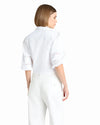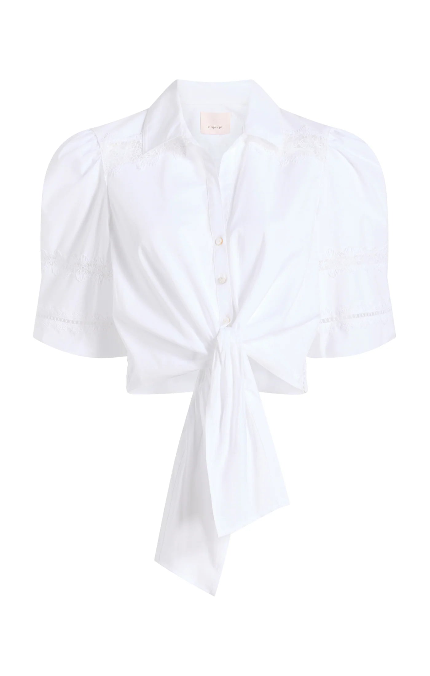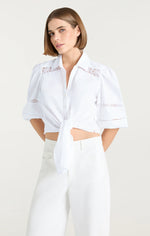 The Three Quarter Sleeve Lace Mare Top in White combines delicate lace detailing with a cropped length for a chic, feminine look. Featuring 3/4 sleeves, a front tie, and a classic collar, this top offers a perfect balance of elegance and casual charm, making it a versatile addition to your wardrobe.