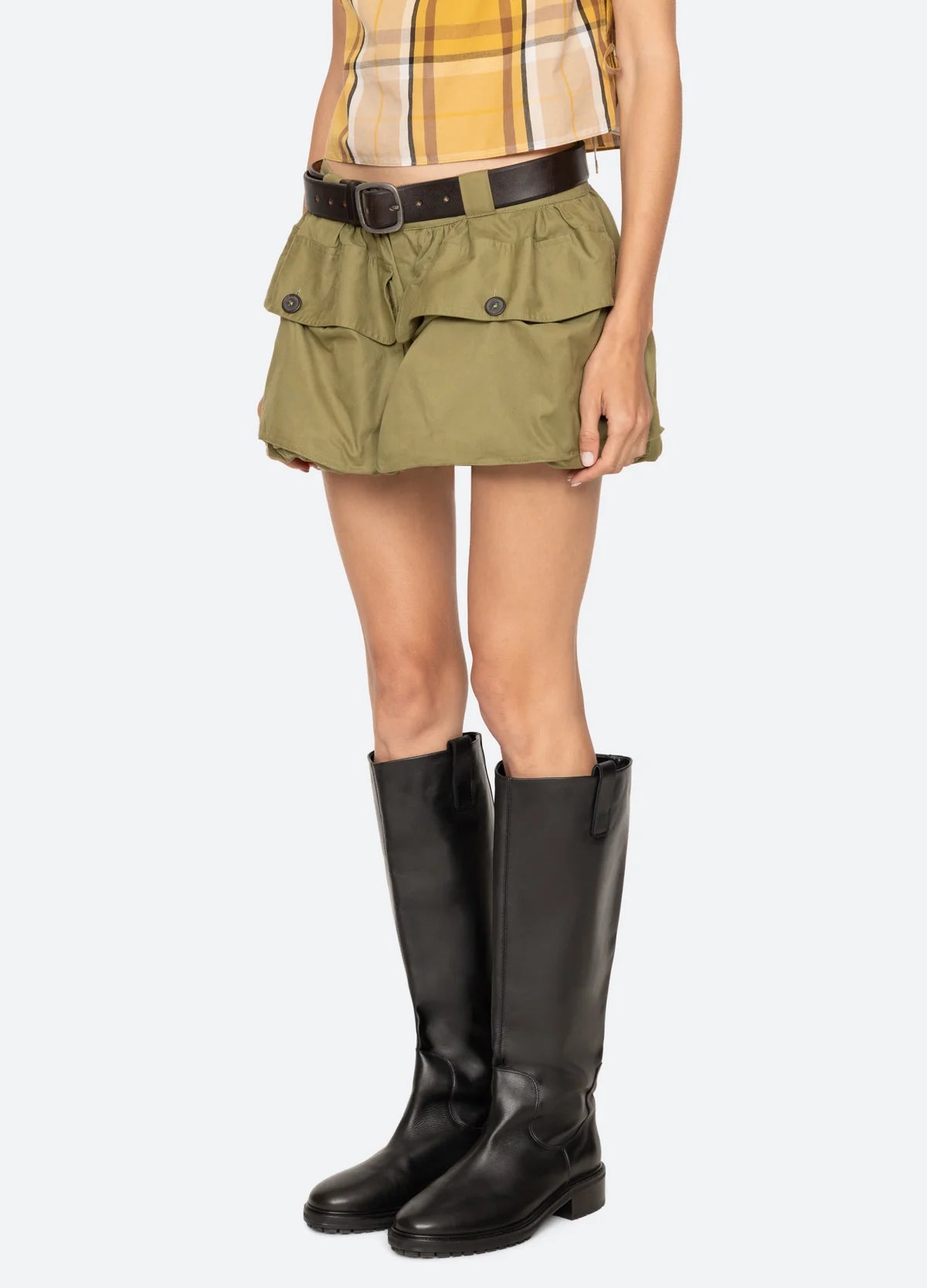 The Andrea workwear bubble shorts feature oversized front pockets and a playful bubble hem. A removable leather belt completes the look, combining practical utility with modern sophistication.