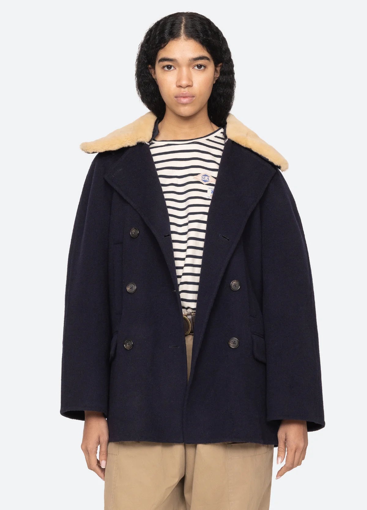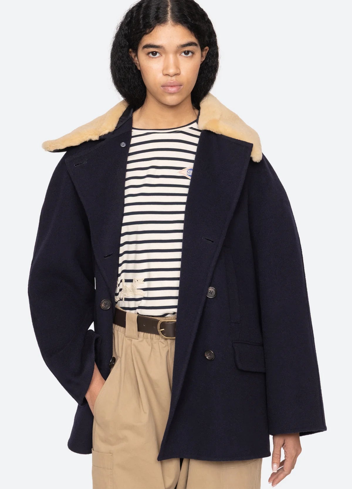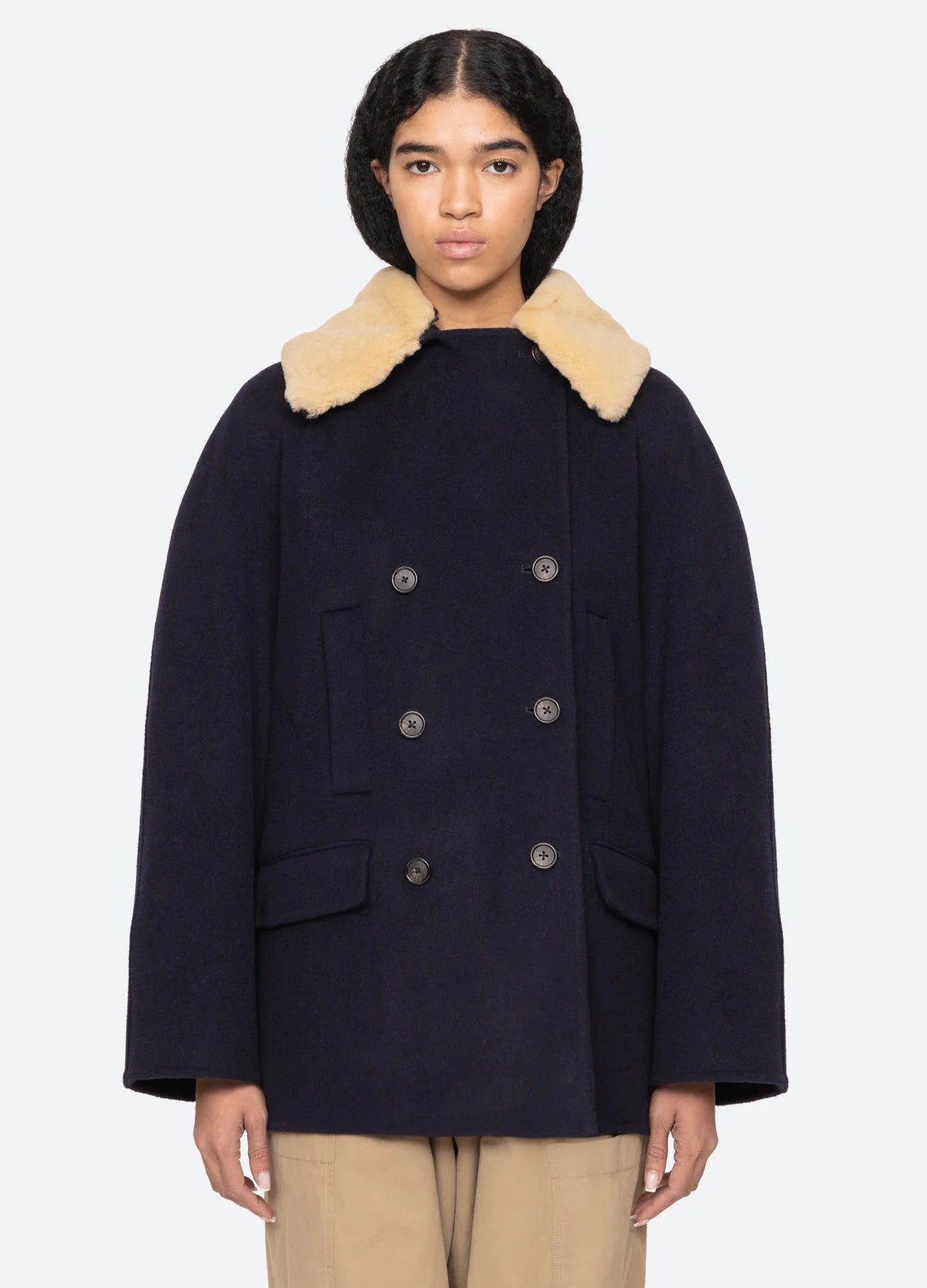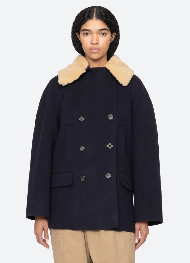 The Astra double faced wool peacoat exudes timeless sophistication with its double-breasted design, plush shearing collar, and streamlined straight-fit silhouette.