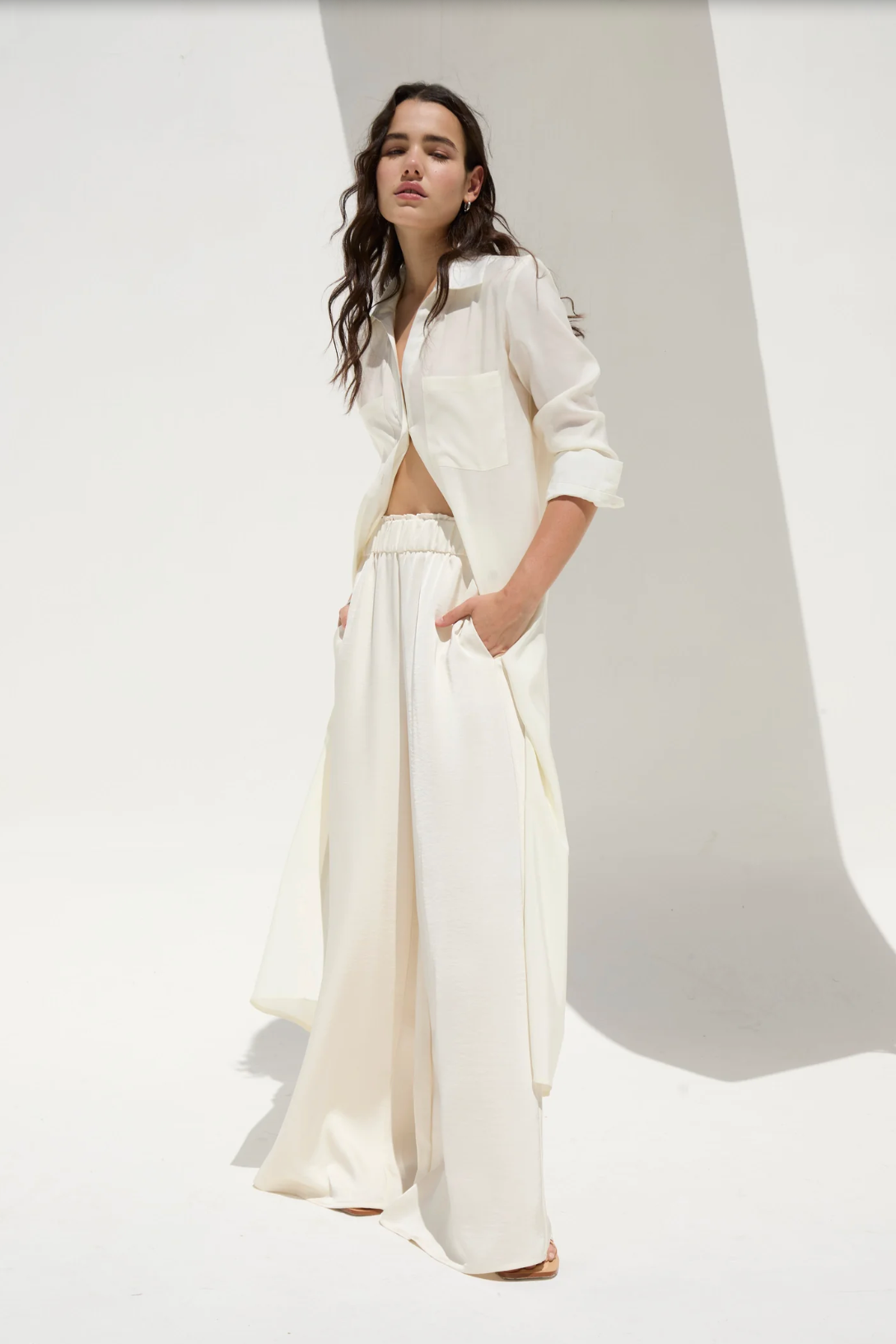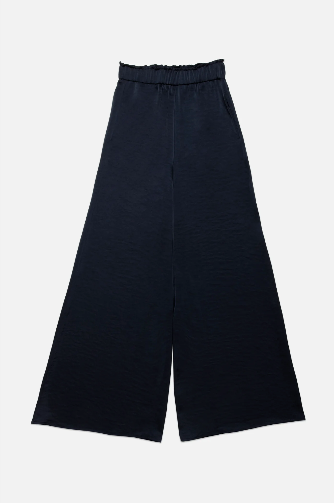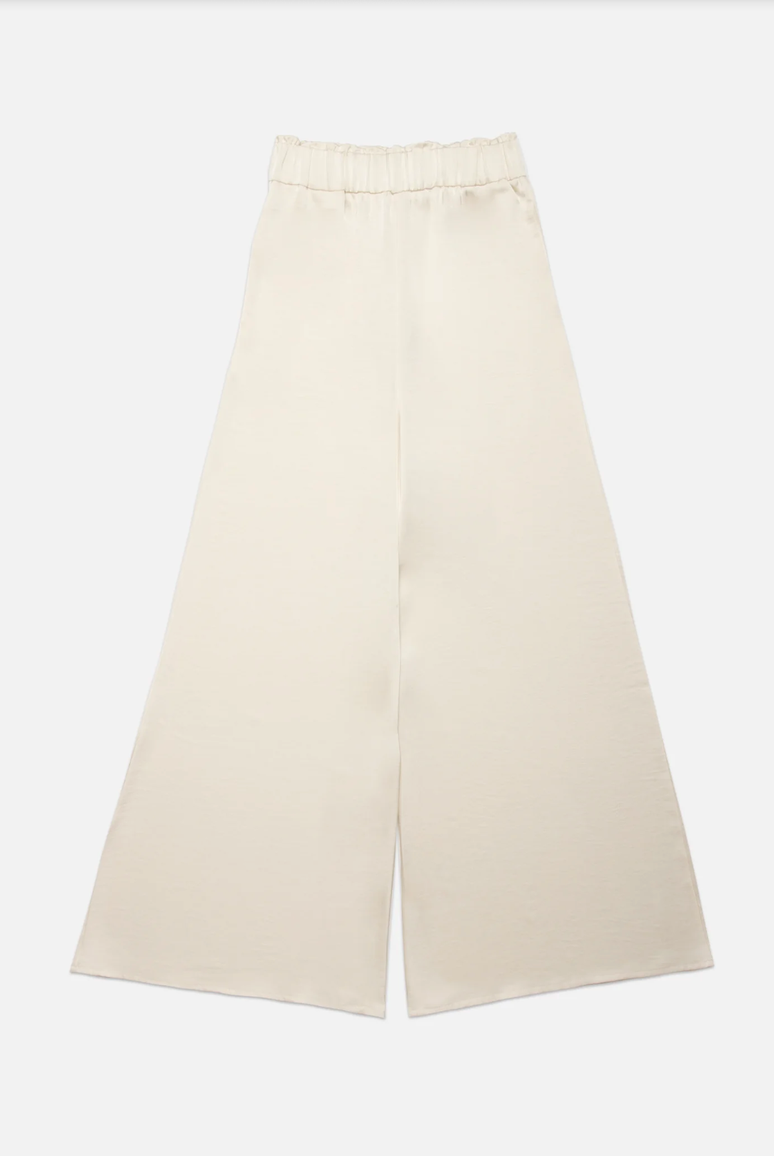 Satin wide leg pleated pants with elasticized waistband. Full length. Side pockets