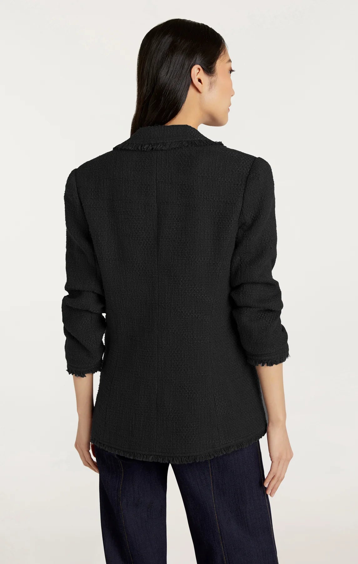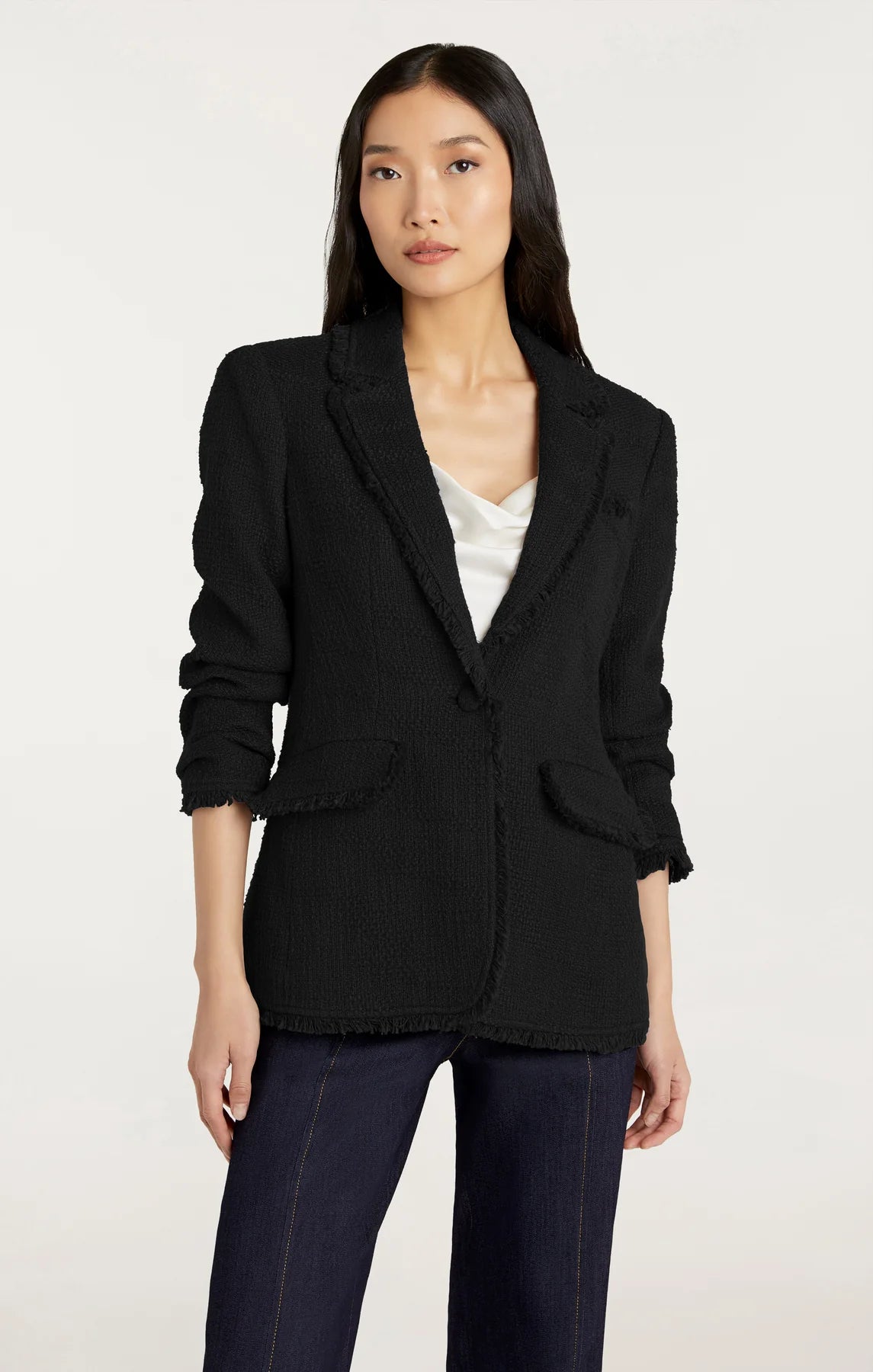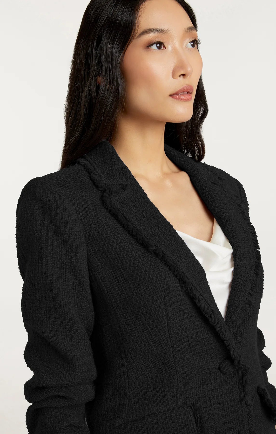 Button up the dashing Boucle Khloe Blazer and relish pre-styled sleeves and notched lapels. Its collared neckline and tailored silhouette make a statement of effortless elegance. Soft and plush fabric makes it a perfect choice for special events that call for both beauty and comfort. Make a timeless style statement with the Boucle Khloe Blazer.