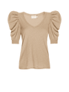 The bold shoulder just got a little bit bolder with this universally flattering V neck, puff sleeve statement tee. Exude femininity. Smocking at elbow length sleeve.